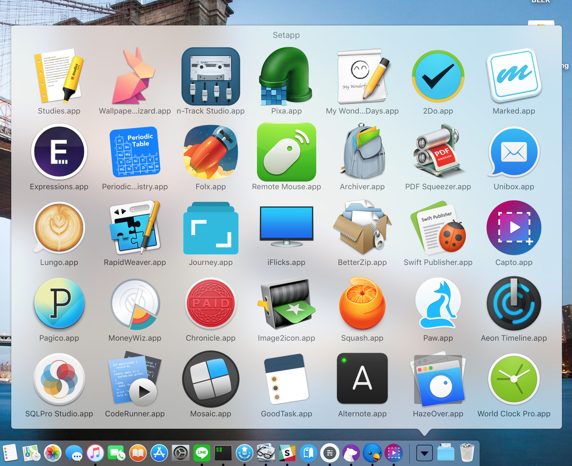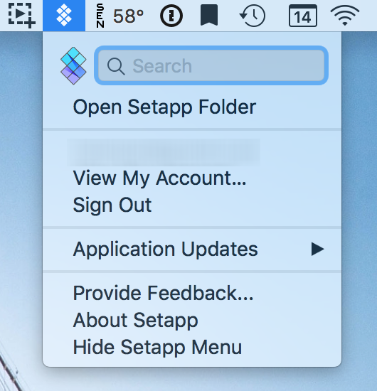 這次看到增量到 100 個 Apps,倒是有點好奇了,於是順著點了連結,果然在帳戶內看到一個月的免費使用期。更新一下去年就下載安裝的 Setapp 主程式,發現有了不少變更:在系統選單列上多了一個圖示選單,可以搜尋以及執行 Apps;在 Dock 列以及 Finder 側邊欄的「喜愛項目」上也放上一個「Setapp」資料夾,同樣可以執行所有的 Apps。