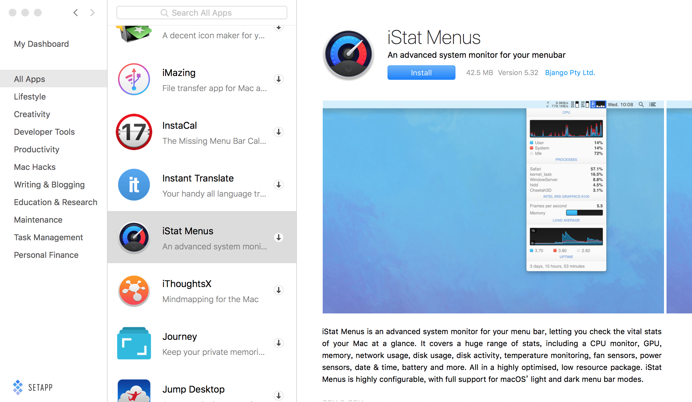 執行主程式後,左側欄有 Apps 各項分類,右側主畫面則是推薦以及新上架的 Apps。點選感興趣的 App 後會切換成三欄式介面,右邊就是該 App 的詳細介紹,點按「Install」就可以下載安裝。由於主要是對 100 個 Apps 的數量有點好奇,花了點時間瀏覽,雖然有些 Apps 還是和我已購買過的重複,但的確也新增不少好用的軟體工具。