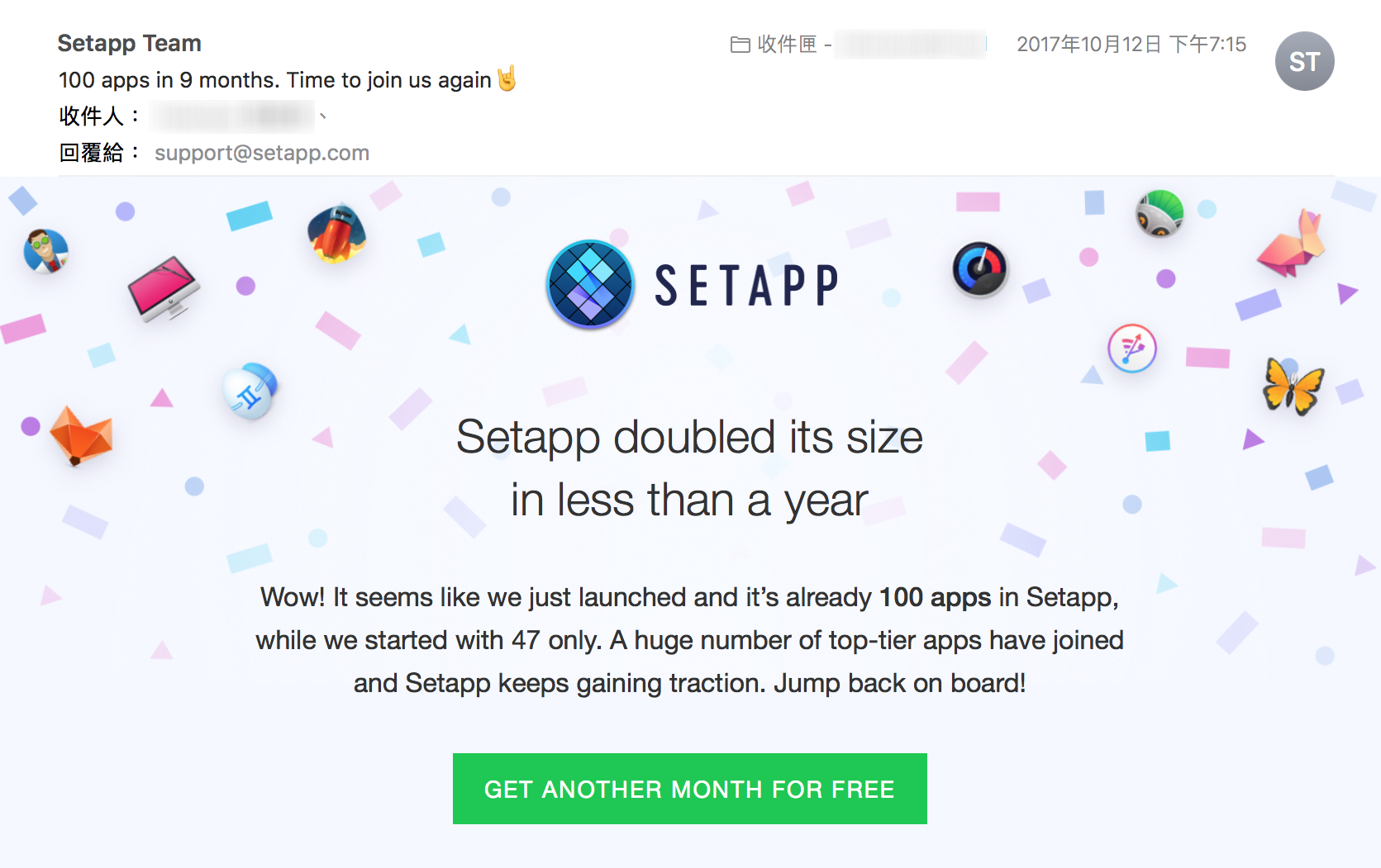 前天收到一封 Setapp 寄來的 email,看了一下是 Setapp 宣傳已經達到 100 個 Apps,順便附個連結又給了一個月的免費試用。