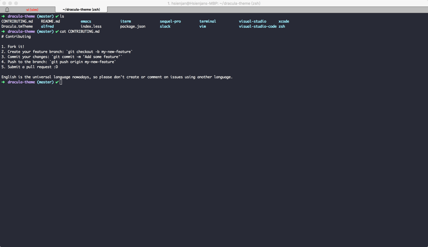 看起來配色蠻雅緻的,一時手癢就乾脆來幫幾個 console 程式變變裝。在上面的主題包中我目前有在用的就:Alfred、iTerm 以及 Vim,至於 Zsh(z shell) 據說是個可以取代 bash 的好用 shell,功能包括強大的自動補全功能、各種插件以及主題的支援等。索性也一併裝來玩看看。