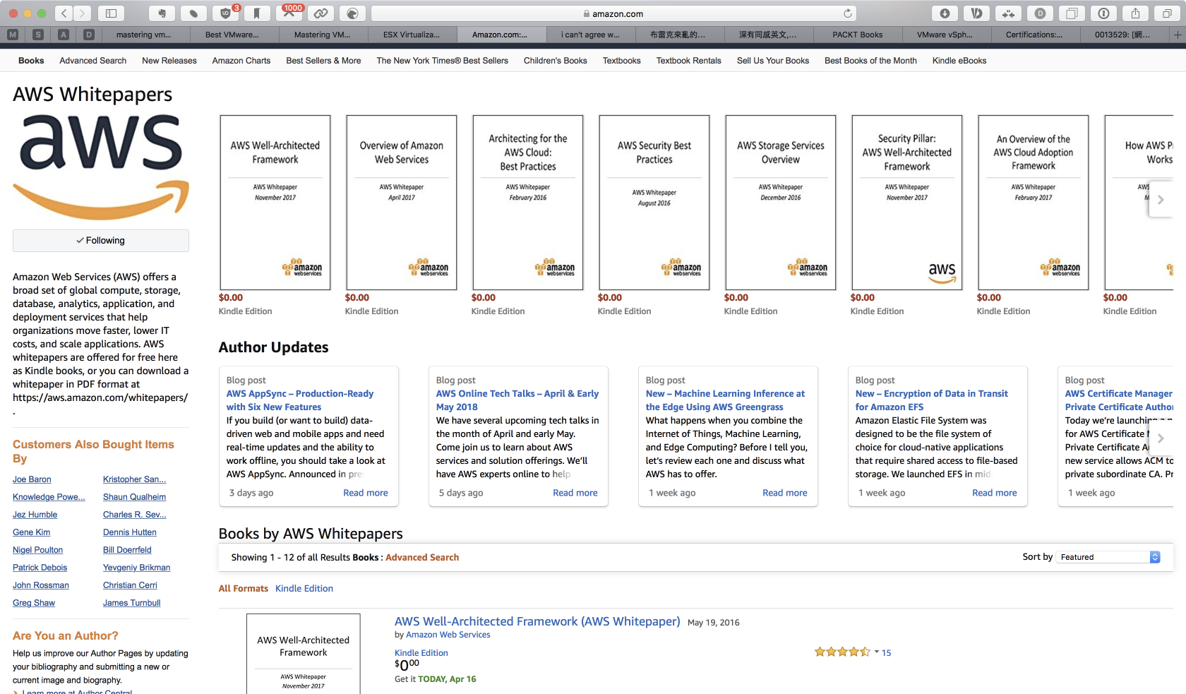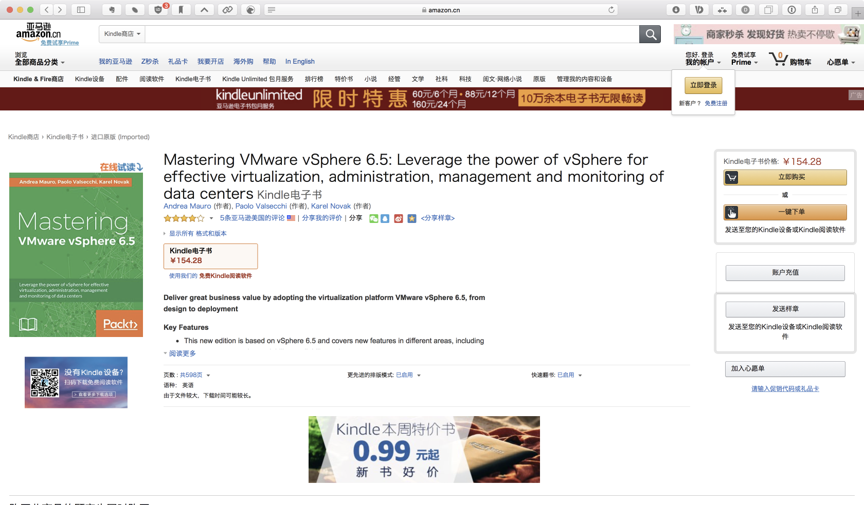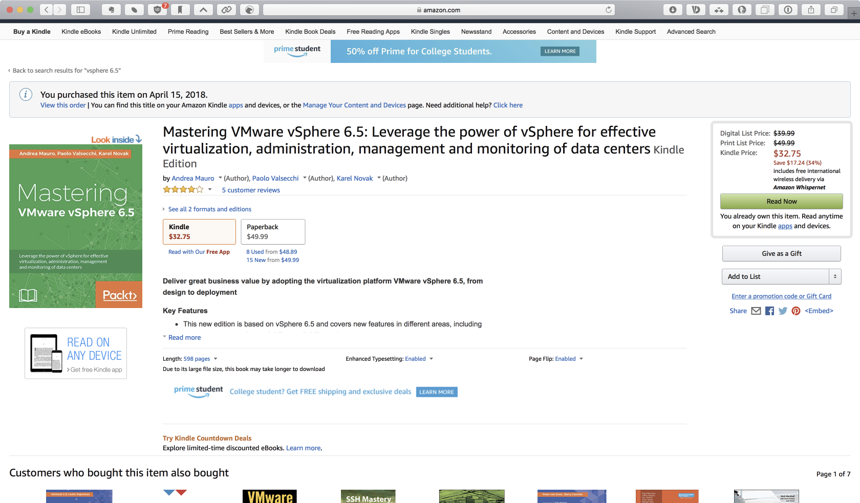所以,只好在美亞的 Kindle 書店找看看有沒有合適的電子書可以購買。正好在這篇文章(Best VMware Books)看到列了一些不錯的 VMware 相關技術書籍,其中好像還蠻推薦《Mastering VMware vSphere 6.5》這本書,在 Amazon 剛好也有 Kindle 版本,線上看了一下試閱,就直接一鍵購買了。說起來,這好像算是在美亞買的第一本付費 Kindle 電子書呢!