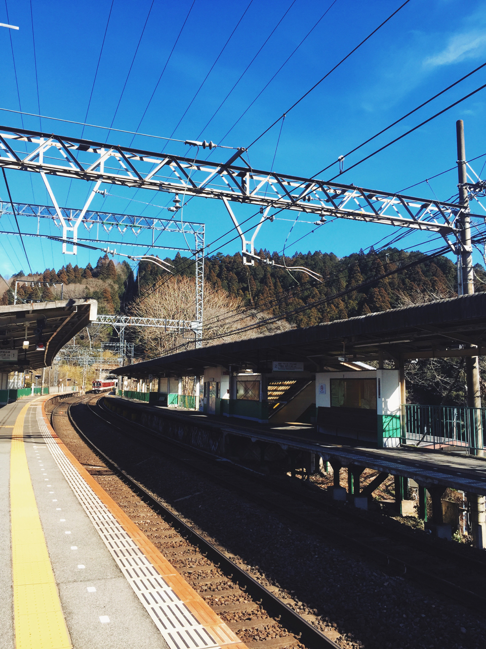 這張照片則是在換搭三線火車(阪急、JR 以及近鐵)抵達「室生口大野駅」時拍的。當天運氣不錯,是個大晴天,陽光和煦。在寂靜的山城小站就隨手拍下這麼張鐵道及月台照片。用的是 iPhone 6 plus 以及 VSCO 這個 App。