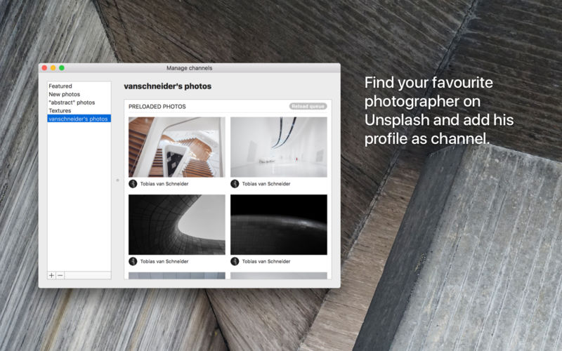 比較特別的是 「個人設置(Profile)」,則是連結到 Unplash 帳號,會在登入時要求取得應用程式的授權。預設有 3 個 slots 可以用來加頻道(channel),如果要再增加就要花費,每一個 slot 是 30 台幣,120 台幣則可獲得無限制的 slots。這部份我倒沒深入研究,由於預設的 Channels 就有二個:Featured 及 New Photos,再加上自己在 Unsplash 收集的一個收藏集(Collection),已經足夠我用了。當然,如果要花點小錢贊助鼓勵一下程式開發者絕對也是物超所值的!
