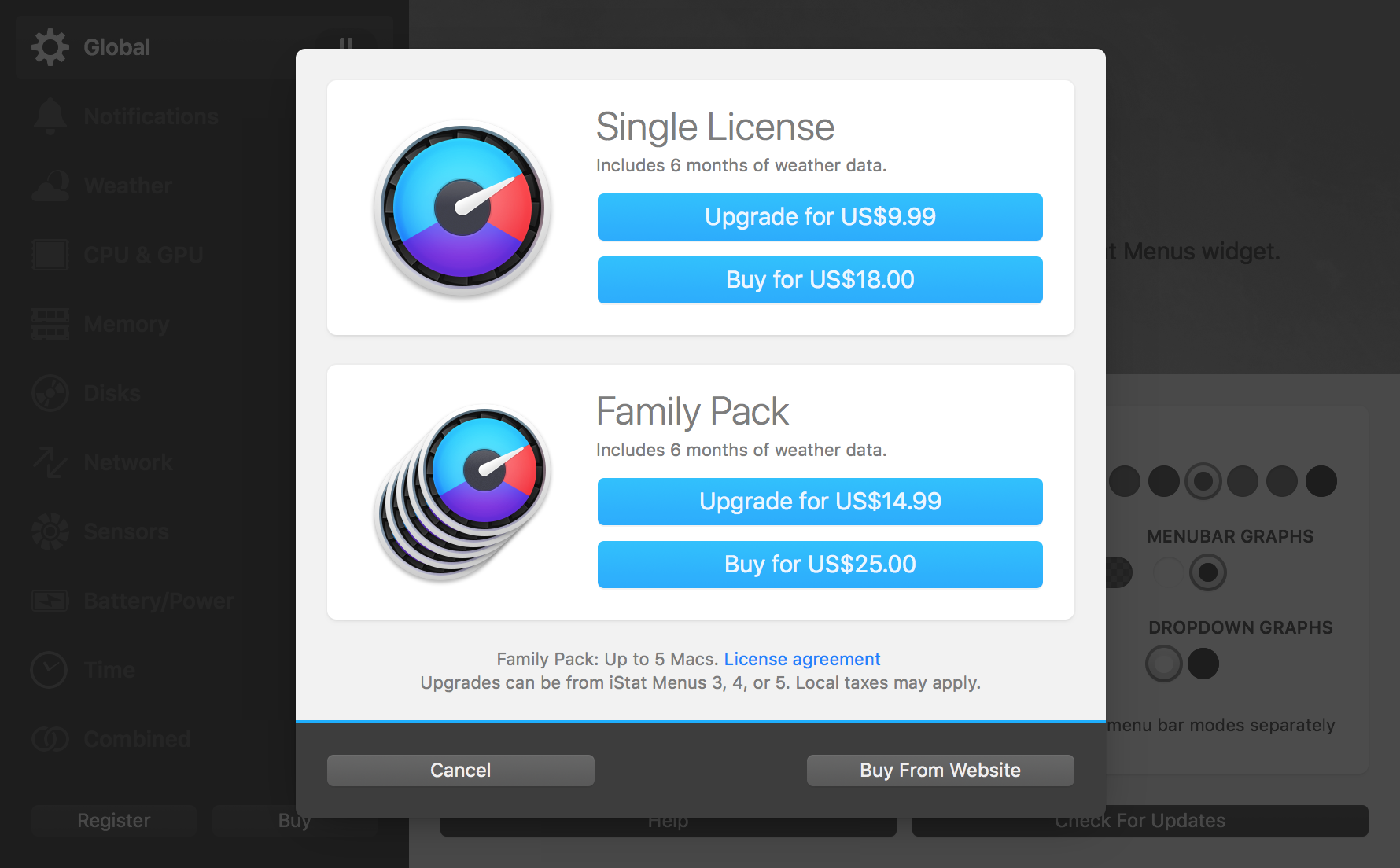 iStat Menus 6 的天氣資訊是使用 Dark Sky 和 Weather Underground 的資料,且 iStat Menus 會依據你的地點自動在二者間選擇最佳的服務來源。不過,這項服務只有在購買的前六個月免費提供(60 分鐘更新頻率)。若到期後要再使用這項服務就必須付費,年費則依據更新頻率而定:從 60 分鐘的 1.99 美金到 15 分鐘的 5.99 美金不等。可以從設定畫面的天氣選項中觀看價目及直接內購。