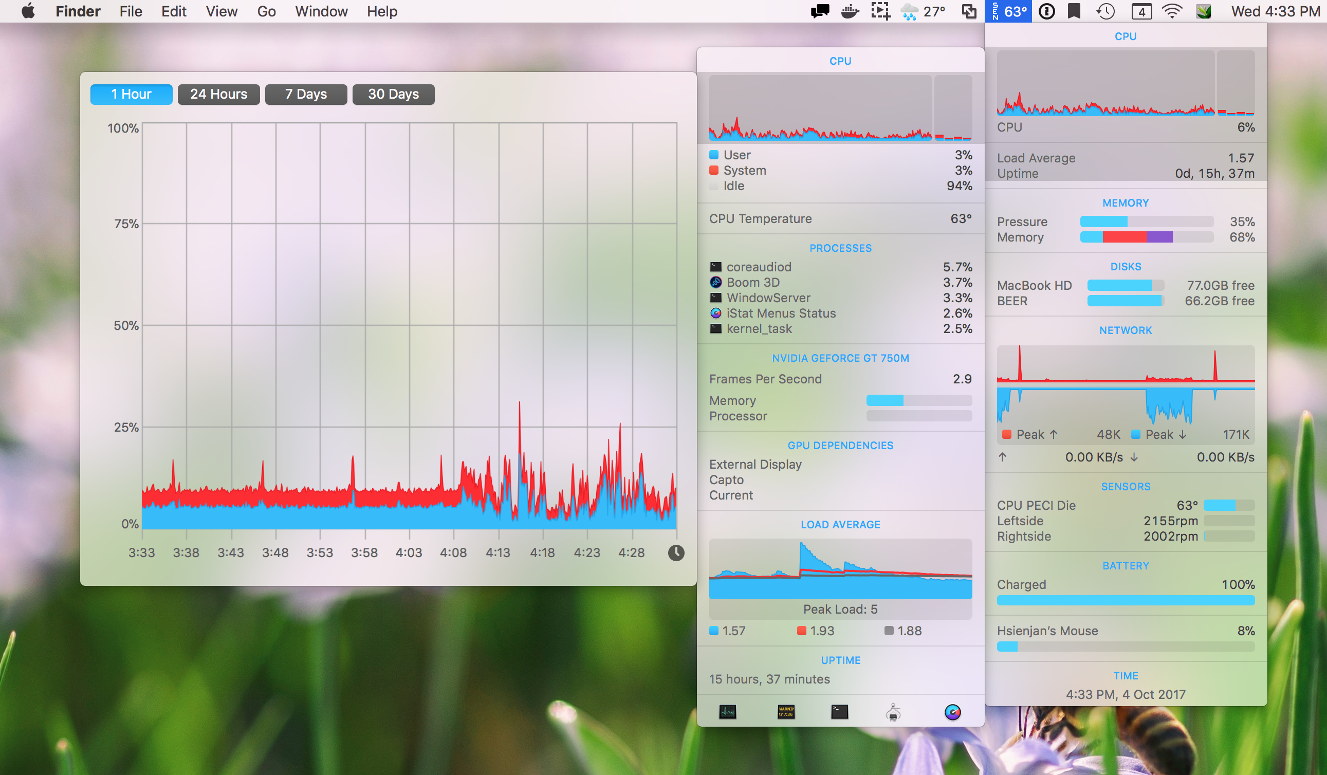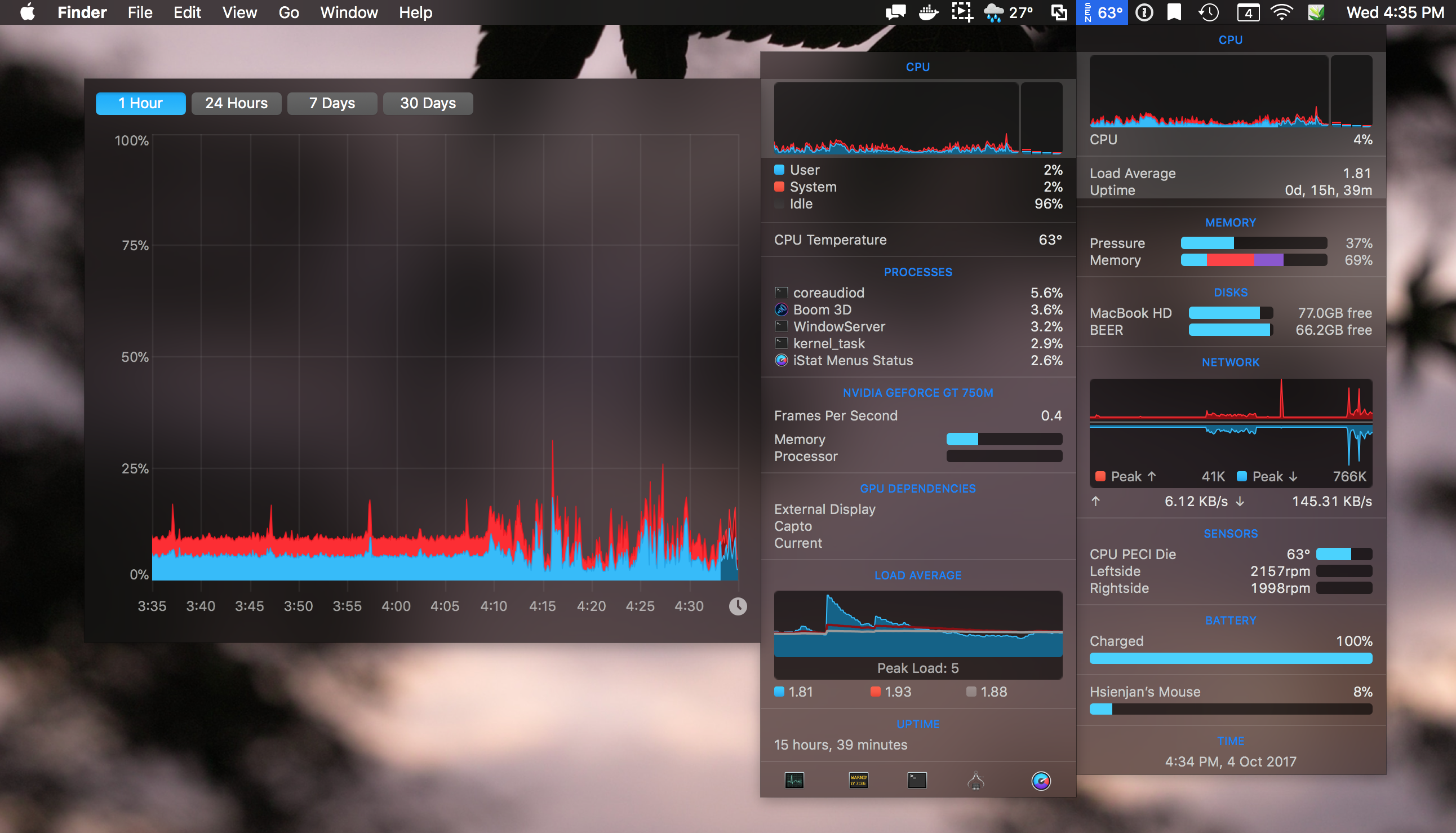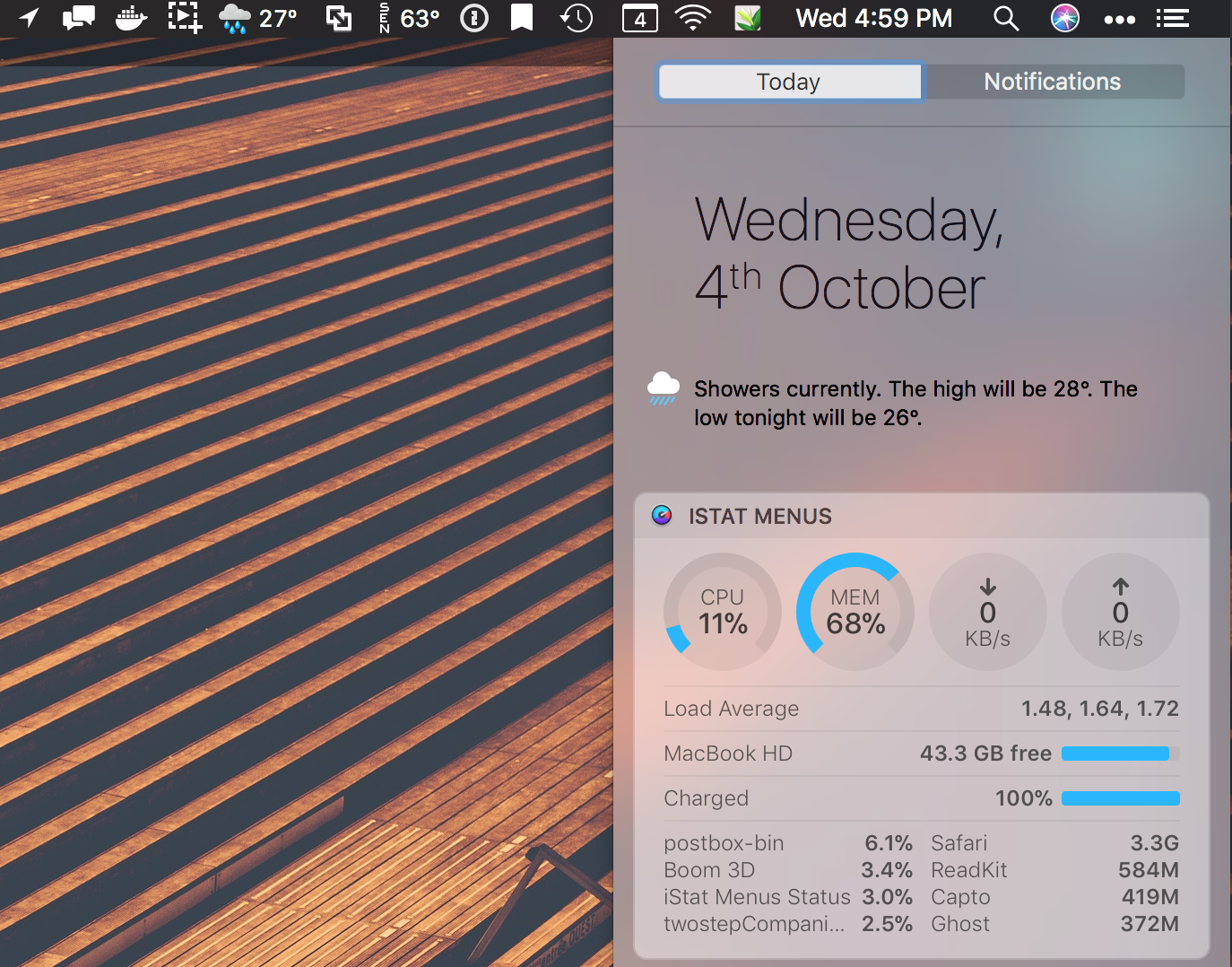 iStat Menus 我從 3 開始一路跟著更新用到 5,一直是 Mac 裝機必備的小工具程式。這是一套輕便卻又能提供詳細系統資訊的監控軟體,除了基本的 CPU、記憶體、網路、磁碟資訊外,甚至也整合了日曆功能,可說是 macOS 上一把精巧萬用的瑞士刀呢。