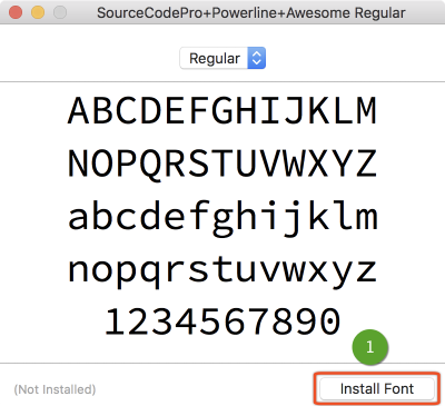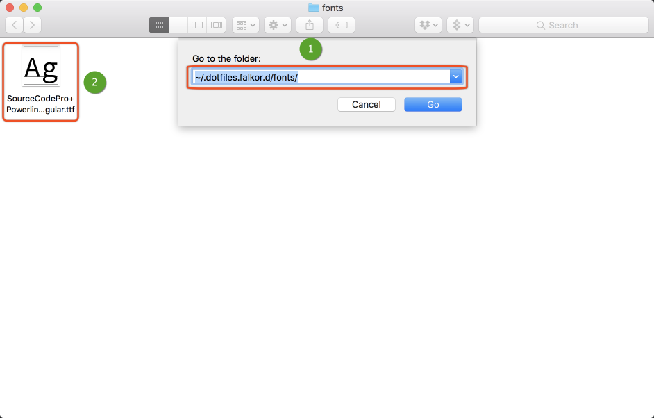 在剛 git clone 下來的檔案包裡就有所需的字型(SourceCodePro+Powerline+Awesome+Regular.ttf)。在 Finder → Go to Folder(或按快捷鍵 ⇧+⌘+G),輸入 ~/.dotfiles.falkor.d/fonts/ 即可開啟檔案夾內容視窗。直接雙擊字型檔開啟 MacOS 字型管理工具,選擇右下角的安裝字型即可:
