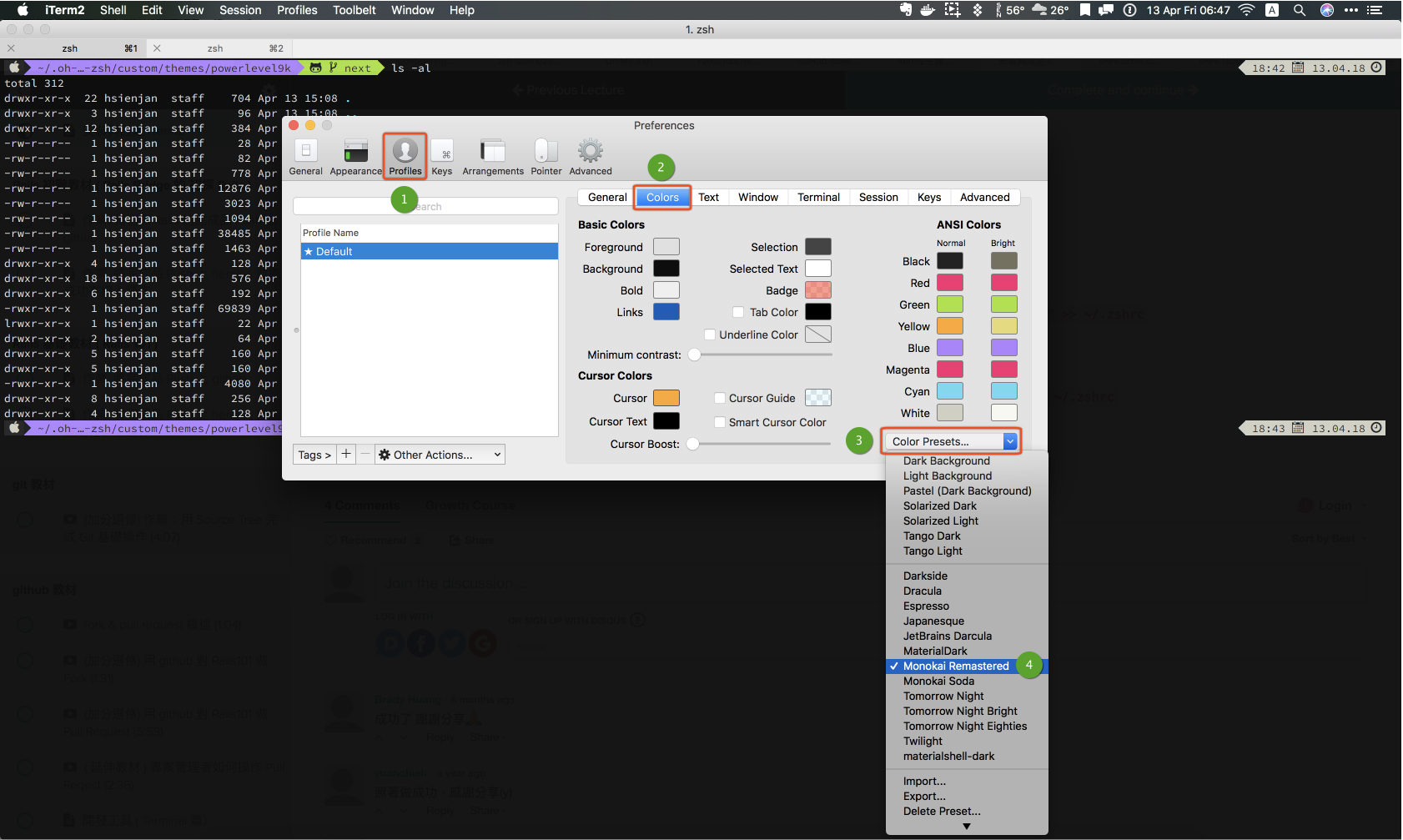 開啟功能表 iTerm → Preferences,選擇 Profiles 再點選配色(Colors)頁籤,從右下角的「Color Presets...」下拉選單中選擇剛匯入的配色主題即可套用。