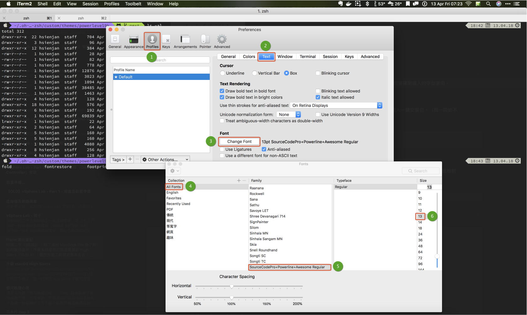 開啟功能表 iTerm → Preferences,選擇 Profiles 再點選文字(Text)頁籤,點擊下方的「Change Font」按鈕選擇剛匯入的字型套用。