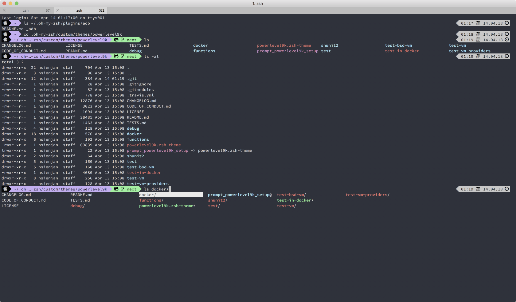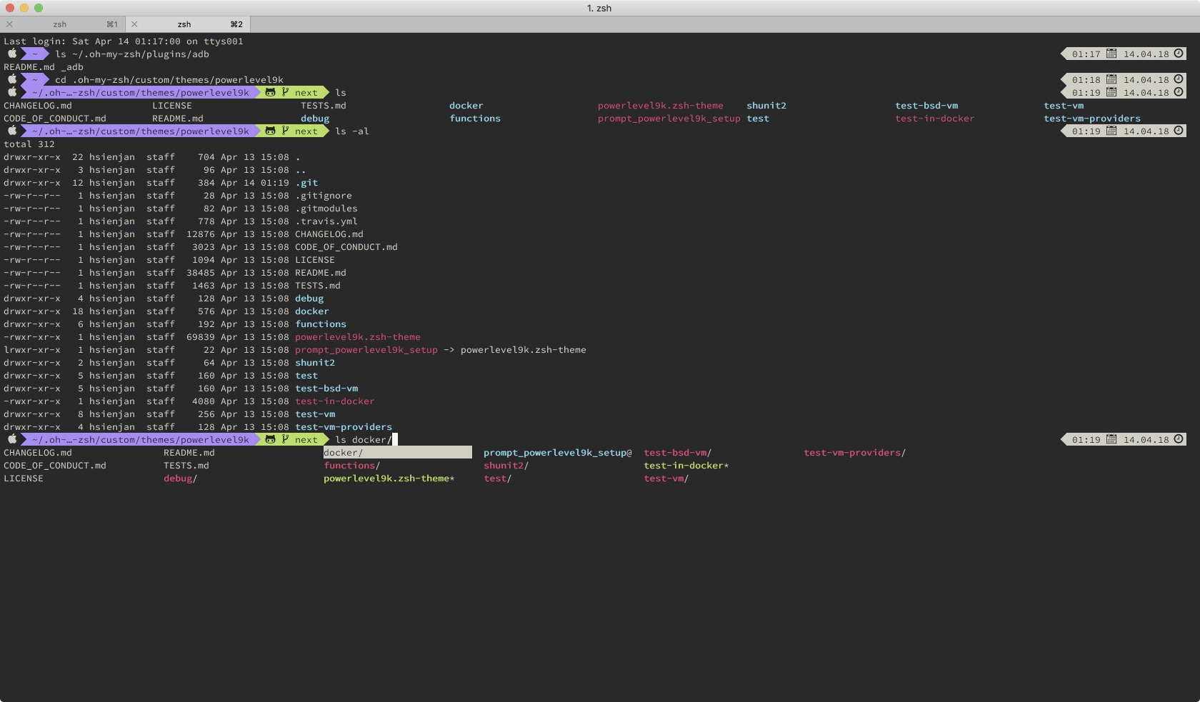 基本安裝到此已經算是完成了,可以關閉再重開 iTerm 就可以看到套用主題後的效果。不過 zsh 的一個強項就是擁有為數眾多的外掛(Plugins),可以為 zsh 添加各式各樣的附加功能。我自己是會再加裝二個外掛:zsh-completions 以及 zsh-autosuggestions,讓日常使用上更順手便利: