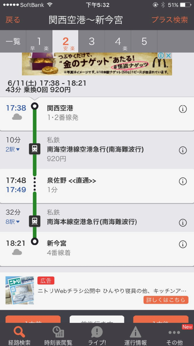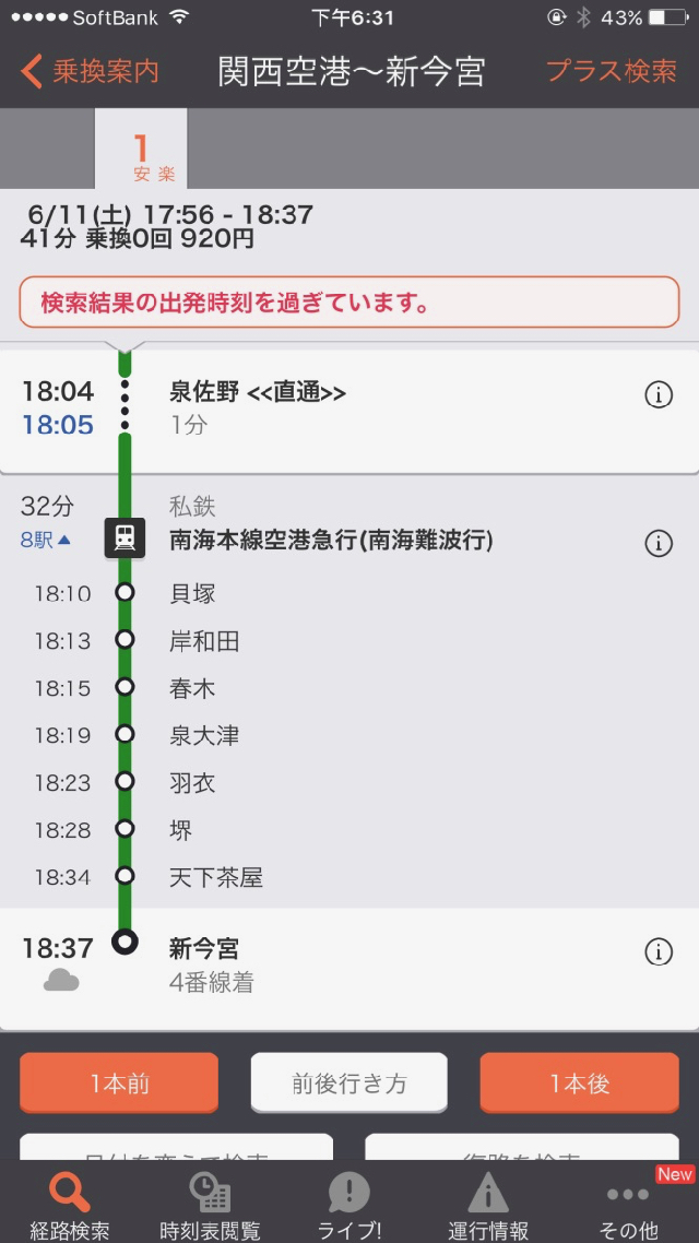 這些事搞定後,也近傍晚了。打開「乘換案內」查詢一下南海電鐵的火車班次,準備前往今日大阪的下榻旅館。訂的新今宮駅旁的中央旅館(Hotel Chou),依然是廉價的三疊大房間。由於免費的「乘換案內」只能查詢到起訖站,索性直接用程式內購,訂閲 Premium 功能,年費是 690 台幣。除了一些有料功能(像是青春 18 票券利用查詢)外,主要還是多了沿線停靠駅站及時刻,這樣一來也不用常要起身觀看對照車門上的路線站名圖,果然是更便利了…
