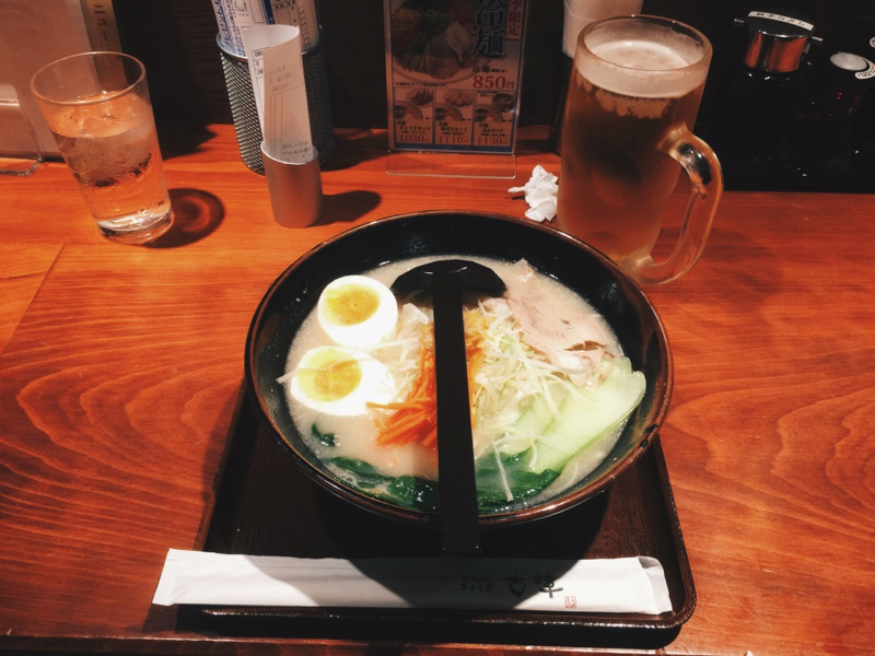 看看時間,已是晚上 9 點過後,商場也差不多都結束營業了。幸好對面近鉄百貨的 12 樓美食區(大阪通)開到 11 點。左右繞了一下,決定還是就吃碗拉麵好了。當然,也少不了要配上杯生啤酒。有點意外的是,這拉麵的湯頭還蠻特別的,應該是有加了桔子(皮),雖是豚骨濃湯,卻多了點清爽味,有點小確幸的驚喜呢……