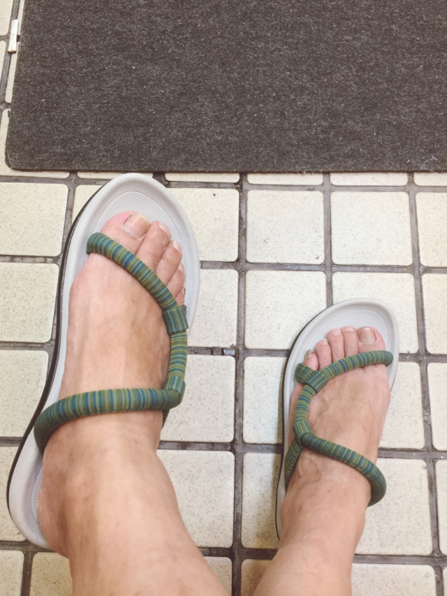 到了 MIO 的 Montbell 賣場時,距離打烊時間不到 20 分鐘。於是我做了件有點囧的事—請店員幫忙看身上穿的這件襯衫領子後的 Size 標籤,選了件中意的花色後,再快速的挑了雙輕便涼(拖)鞋,終於在打烊前順利完成採購行動。
