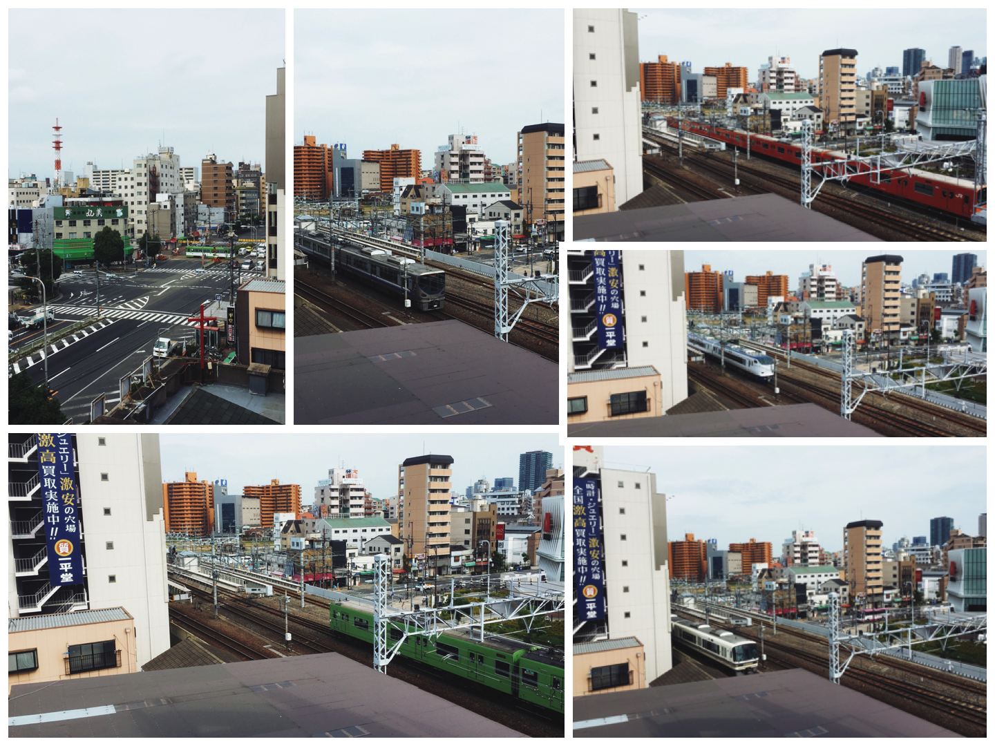 由於旅館是早上 10 點就要 check out,所以大約 8 點半左右就讓手機的鬧鈴叫起床了。推窗外望,就是新今宮駅的鐵道。邊聽著火車在鐵軌運行的隆隆聲音,邊用手機拍照,不到 5 分鐘的時間,就拍下了 6 列不同線的火車:JR、南海電鐵以及阪堺電鐵。