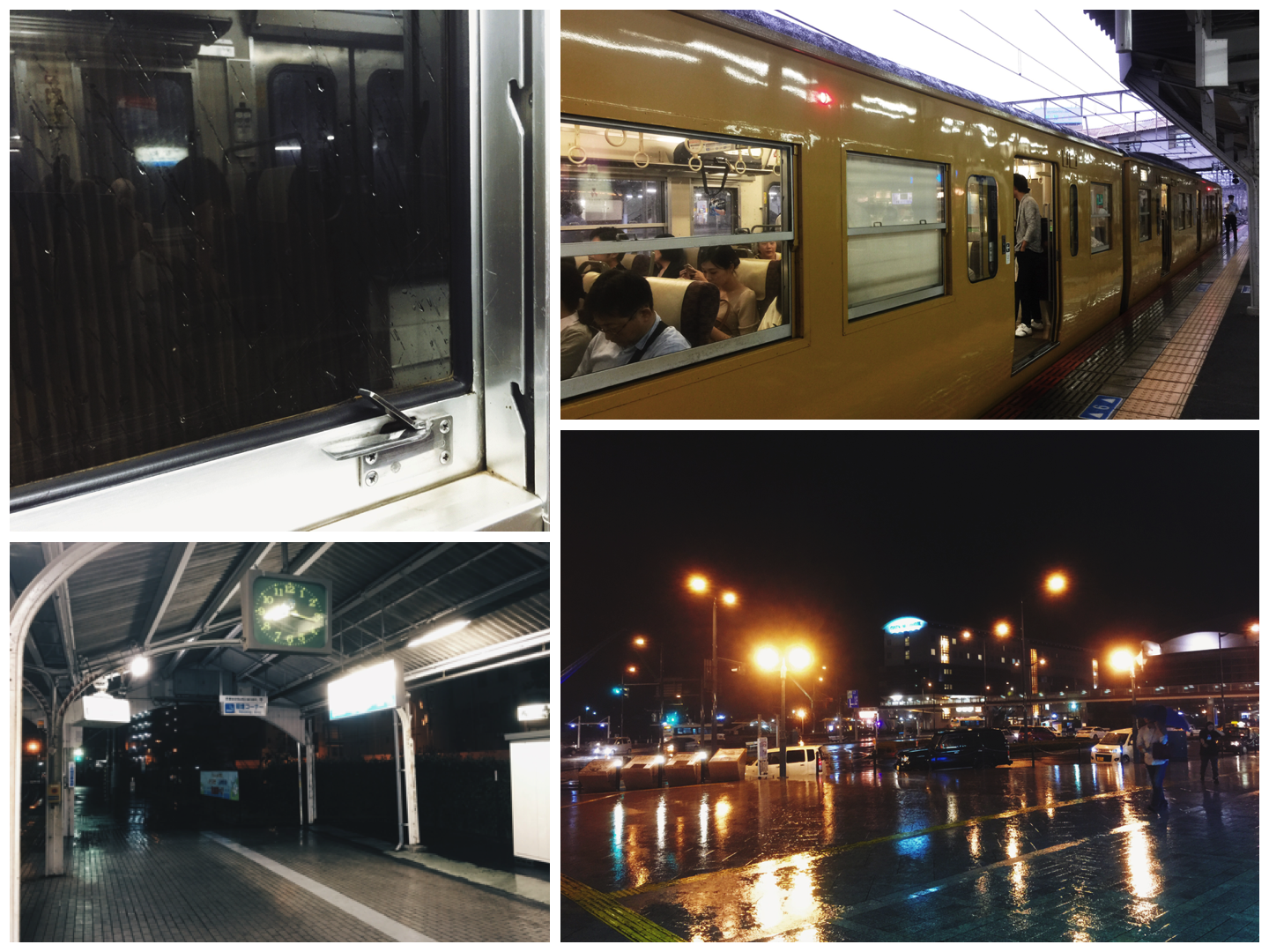 搭上 JR 山陽本線的火車,準備要前往尾道投宿了。火車是站站皆停,各個車站感覺也都是小規模型的,看著舊式的車窗及窗上飛散的雨滴,竟不免有種台灣那舊式平快列車的錯覺。夜色中窗外望出去,沿路幾乎都是平房或原野,開始有鄉下的感覺了。有點訝異的是很多房子都沒亮光或僅有微弱燈光,竟忍不住胡想該不會還有著用油燈的人家吧(噗)……