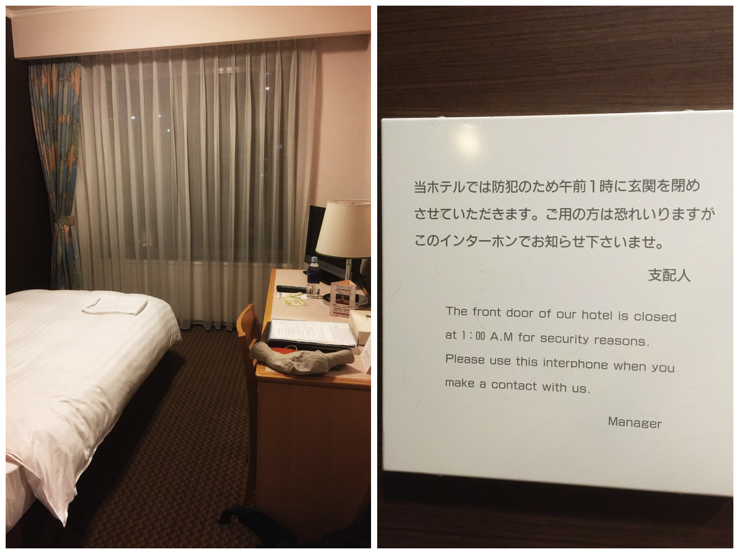 酒足飯飽後,就該去投宿了。訂的旅館是 Green Hill Hotel,就在駅站對面,步行過去即可。不過,有點小意外的是接待大廳在二樓,得搭電梯上去。一開始我還走過頭了,回頭又找了一會才順利 check in。由於是觀光旅館,所以房間還不錯,也有獨立衛浴間。算是一個人旅行中難得住到比較好的房間。不過,稍有不方便的是這裡不提供吸煙房間,且半夜會有門禁,1 點後大門就會鎖上。要下樓抽菸可就困難了(嘆)……
