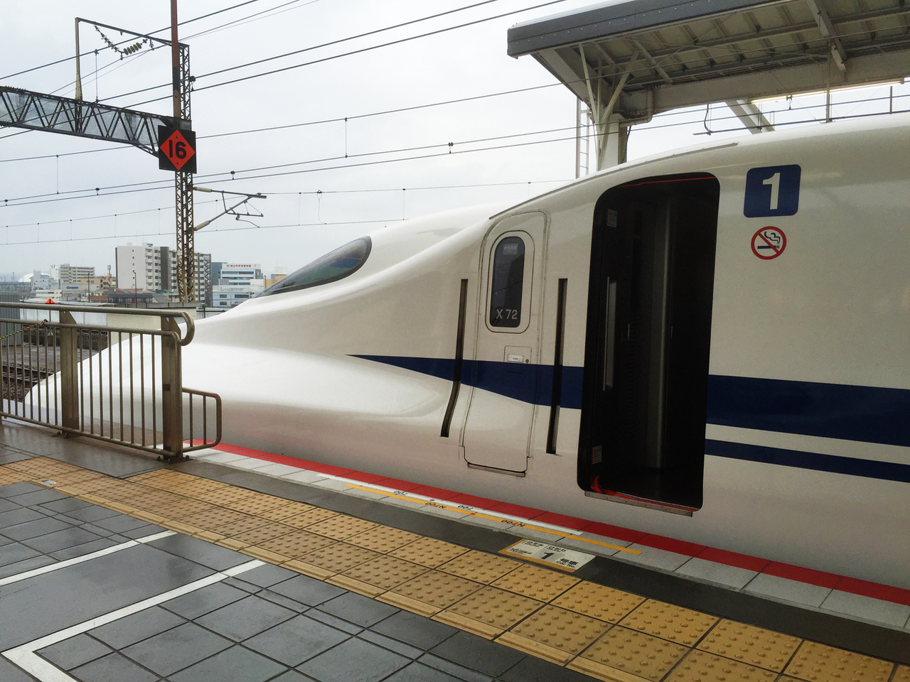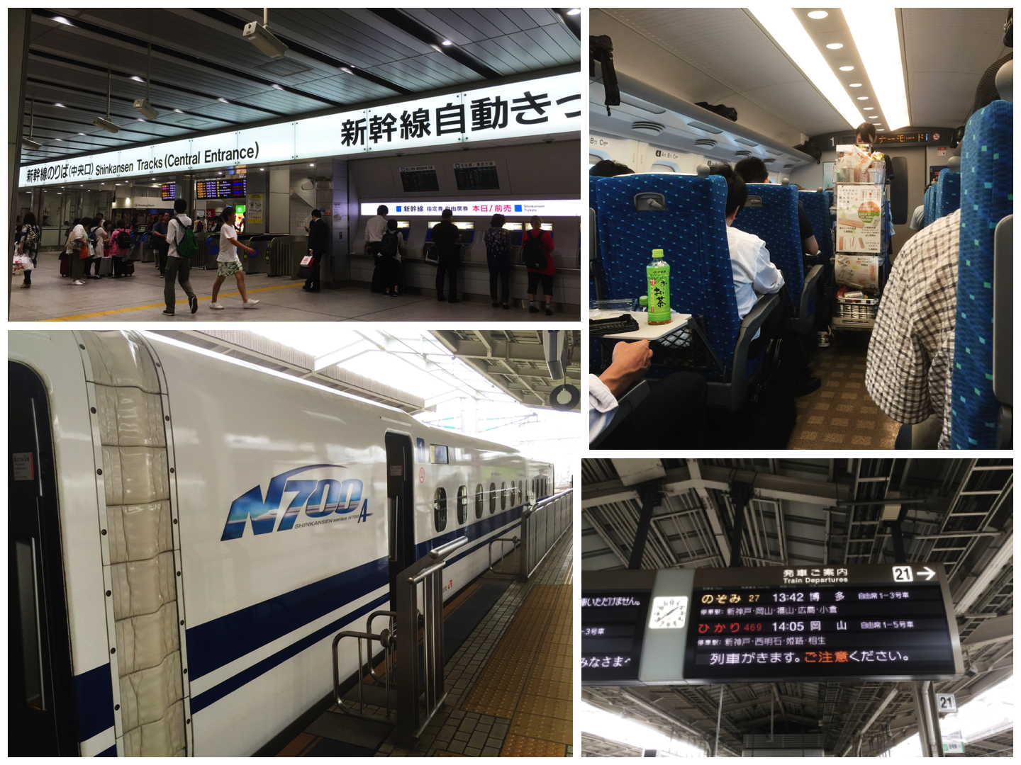感謝「乘換案內」的即時查詢功能以及清楚的發車月台番號。即使比預計的時間早到車站,仍然順利搭到當下的新幹線班次。由於周遊券只能坐自由席,所以其實是有點擔心不一定有座位。不同班次的自由席車廂不儘相同,不過都會是從第一車開始起算。幸運的是在第一車找到了空座,雖然還是有點可惜並非是靠窗的位置。