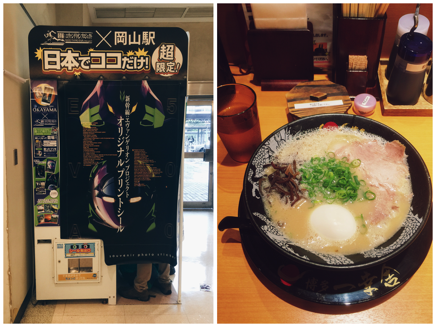 出了車站後,雨勢卻漸漸大起來了。這樣的天氣加上背著大背包,不免要望空興嘆。也罷,既來之且安之,先在站內的商店區稍逛一下,順便用個餐,再想想等等要如何行動。一樓有間博多一幸舍拉麵,看了一下攤位旁的海報,似乎在台灣的新竹也有分店。在售票機買了餐券後,卻才發現原來也可以用 ICOCA 卡(囧)…