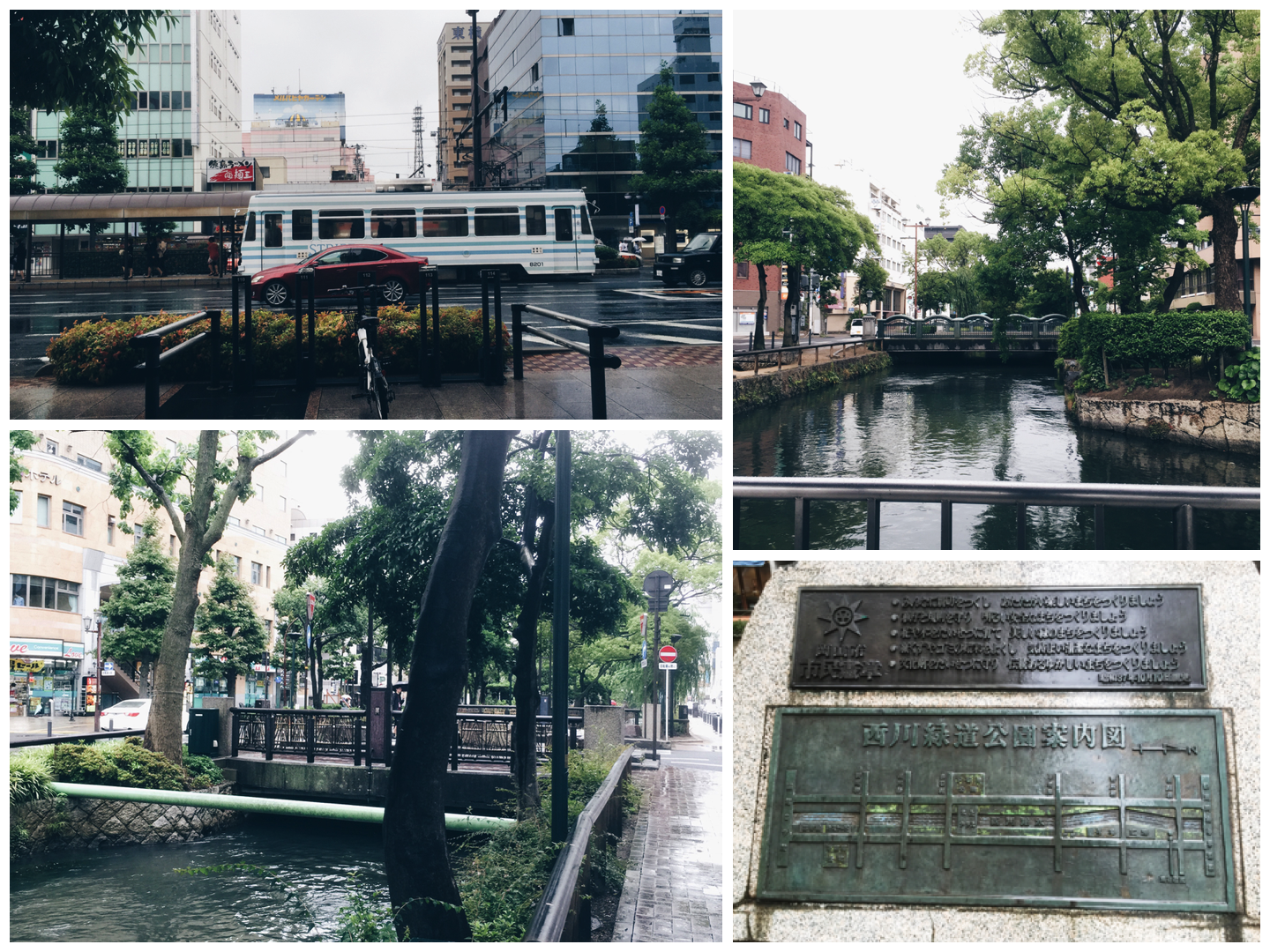 從站前的桃太郎大街(據說岡山正是桃太郎的故鄉)前行,再左轉沿著西川綠道漫步。可能是雨天的關係吧,路上行人稀少,與車站前的熱鬧喧嘩成明顯對比。溫度隨著落雨開始下降,略帶寒意,一路踱步徐行,竟有些許斜風細雨的味道。這裡不是京都,否則恍忽間,幾疑似該有個撐著把油紙傘的櫻花姑娘碎片細行而來……