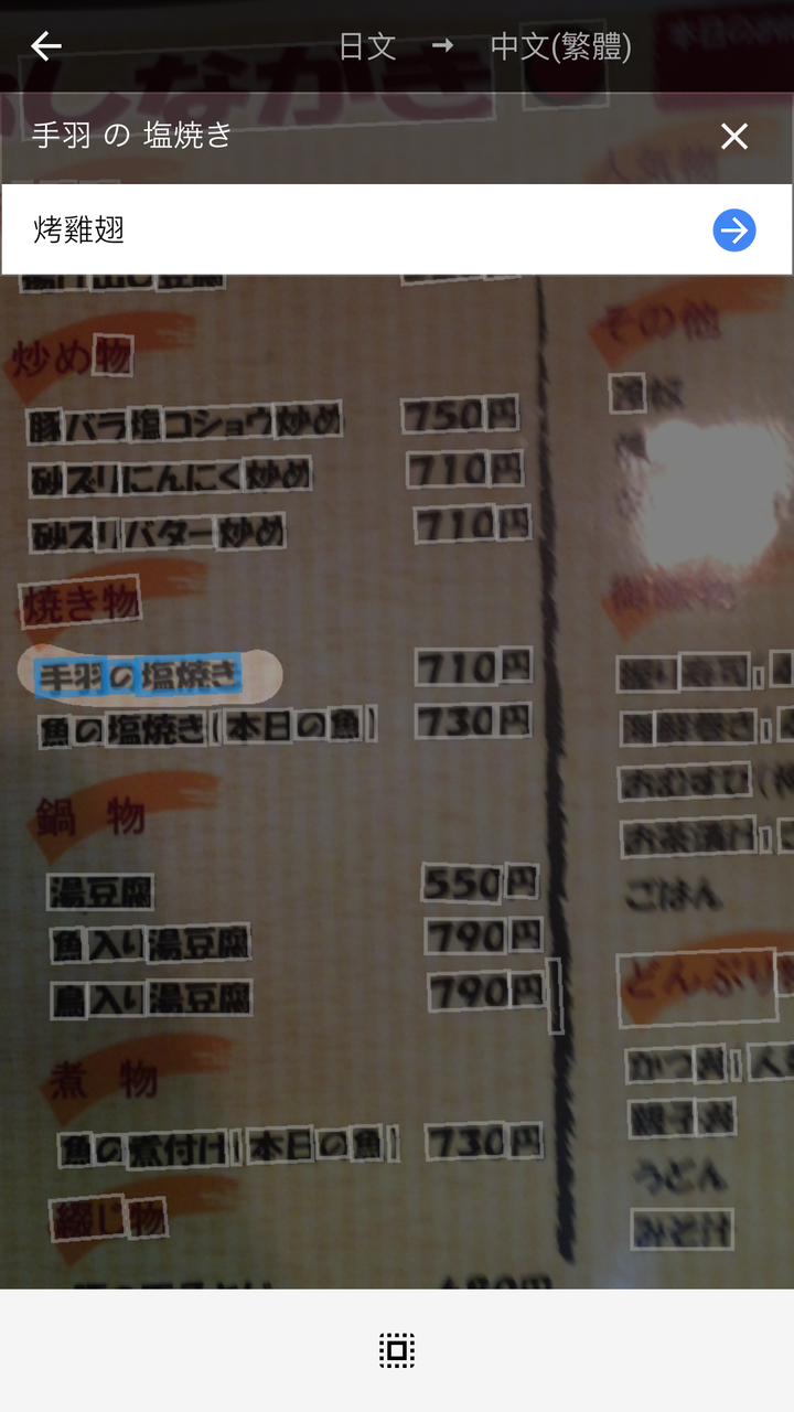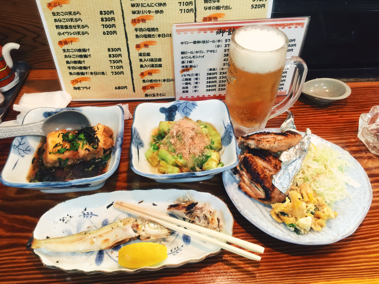 店不大,菜單只有日文,用英文問了一下是否有英文菜單,服務的阿桑一臉茫然。好吧,山不轉路轉,打開手機的 Google 翻譯,拍照掃瞄一遍。如此如此這般這般,一段時間後,面前已是酒菜皆上了。菜色曰:揚出豆腐、當日烤魚、烤雞翅、烤茄子和理所當然的生啤酒。不過,Google 翻譯似乎有點小誤,那道烤茄子,不管怎麼看怎麼吃,都應該是烤絲瓜吧?!