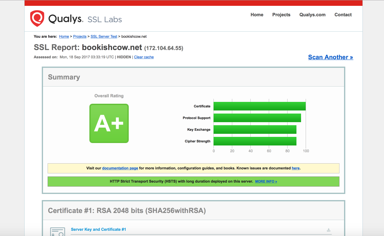 另外,依照上述的修正及設定,SSL 憑證也可在 SSL Server Test (Powered by Qualys SSL Labs) 正常通過測試並取得最高的 A+ 級評等。