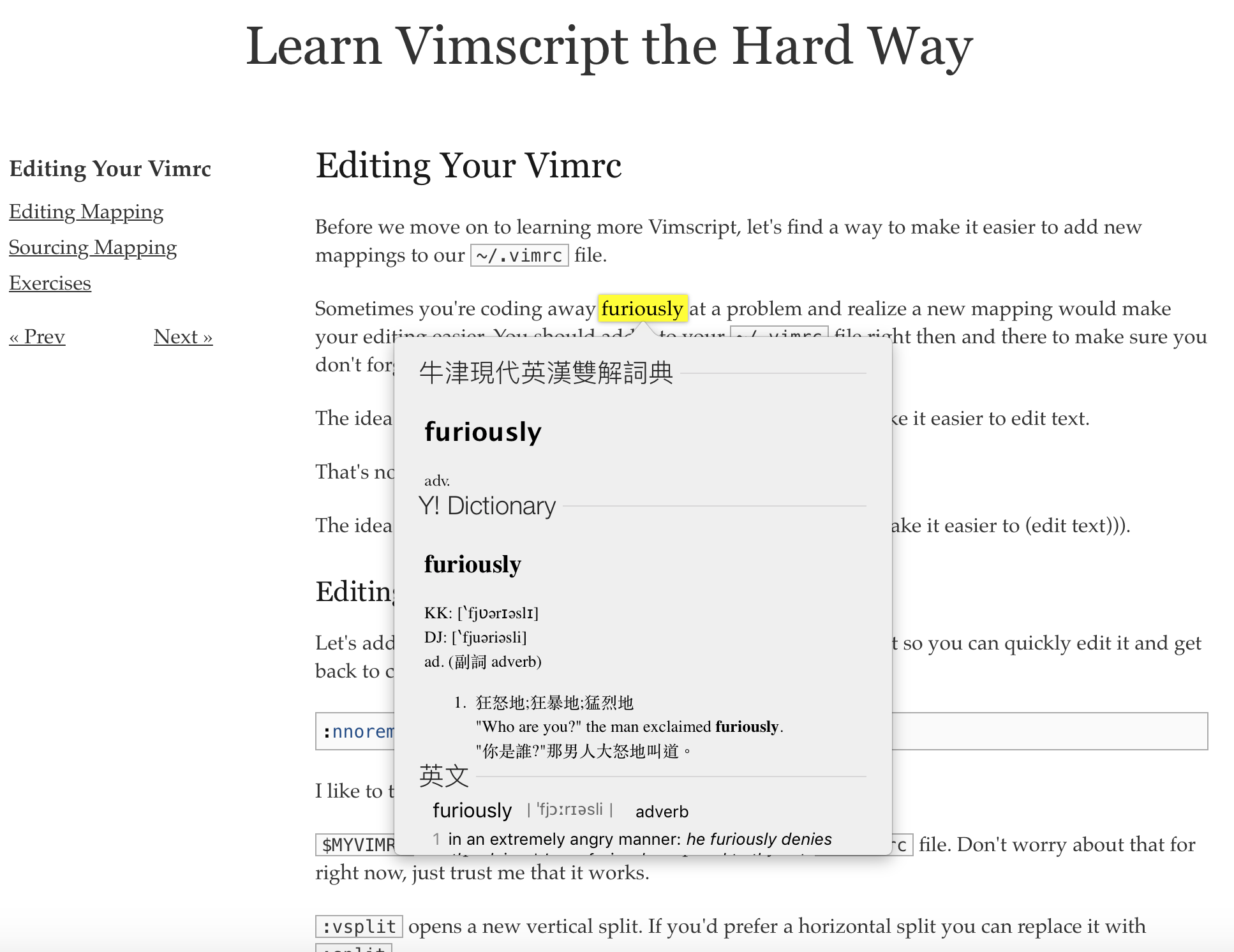 在看一些原文手冊資料,其實還是少不了得查字典,之前多是在瀏覽器中另開新標籤網頁查詢線上的字典。不過,如果瀏覽器標籤頁開多了(我基本都是 20 個以上),在切換時還是會有點不順手。