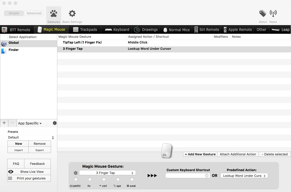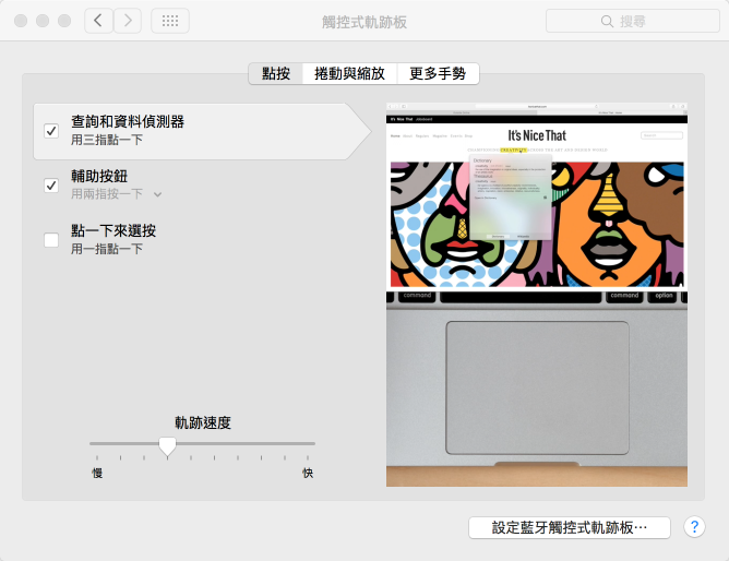 另外,若是配備有 Multi-Touch 觸控軌跡板的電腦(例如 MBP、MBA 等筆電),也可以在系統設定中開啟三指點按查詢的功能。同樣就能利用三指點按觸控板的方式呼叫查詢結果視窗。由於我慣用 Magic Mouse,加上一直有在使用 BetterTouchTool(之前是免費的,今年已改為收費軟體),所以直接就在 BTT 上為 Magic Mouse 同樣加上三指點按的查詢功能。