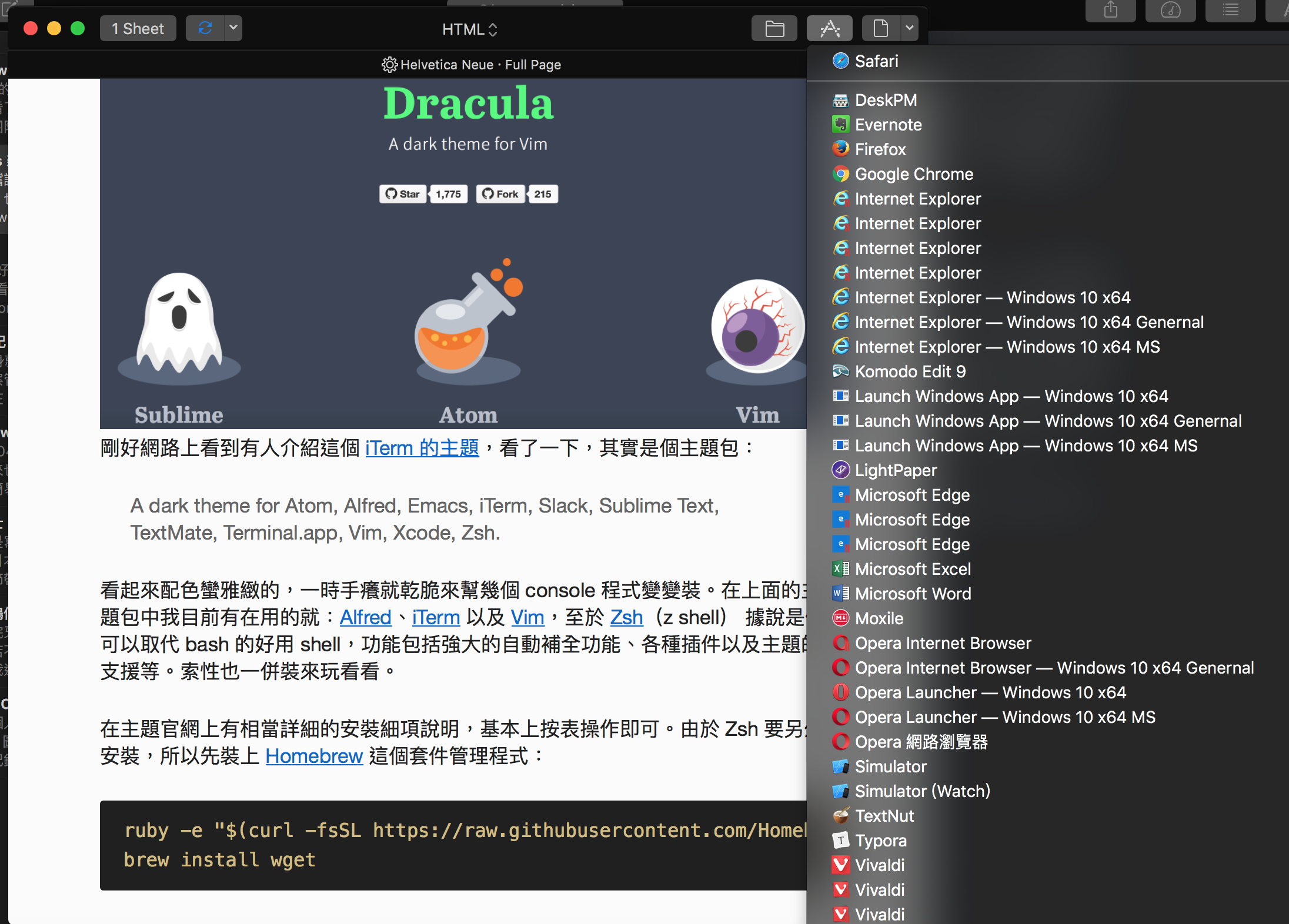 至於 Markdown 語法的支援,則有:Markdown XL(Ulysses 自定義的擴充)、Markdown、Minimark 以及 Textile'd。目前我還不是很了解這幾種語法的差異,但就在這二天的文章寫作測試上,卻發現到並沒有支援表格的語法(《Markdown 編輯器選擇》)、程式碼區塊的語法似乎也不太一樣(《換裝》),也不支援語法高亮度顯示(Syntax Highlight)。