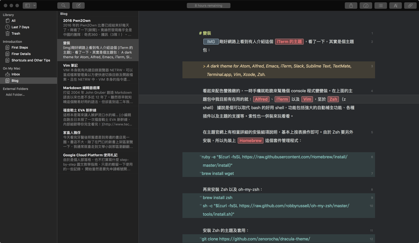 這二天試用以及實際寫作下來的體驗,整體感覺只能用舒適暢快來形容:簡潔優雅的操作介面、直覺卻又強大的功能分類設計以及專注在寫作目標的設計哲學。無怪乎是目前評價最高的(Markdown)寫作工具軟體。二次獲得 App Store 的年度軟體推薦也真的是實至名歸!
