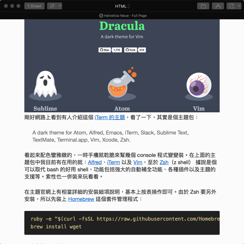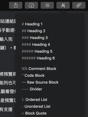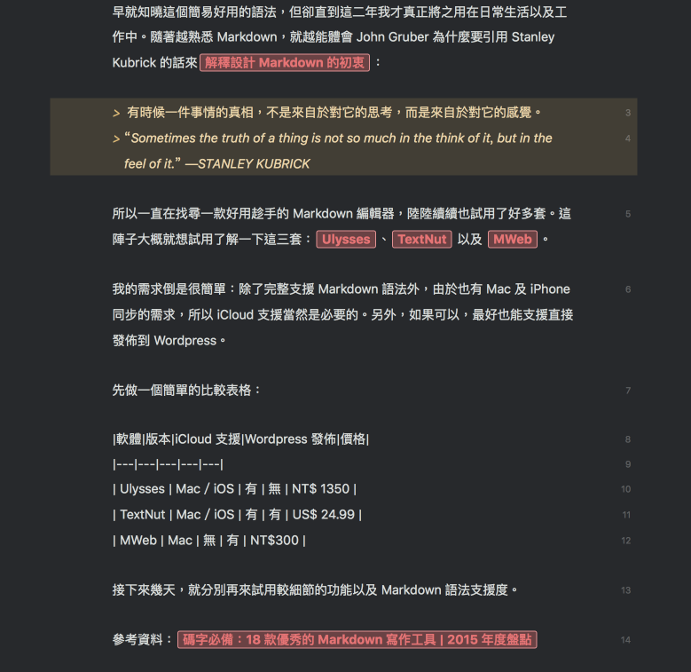 這幾天嚐試就以 Ulysses 來當成 Blog 的前置編輯器,也就是先在 Ulysses 中以 Markdown 來寫文章,待完稿後再轉出貼到 Wordpress 中,做一點類似圖文版面的小修整後即可發佈。同時也順便試用一些 Ulyssses 較細節的功能。