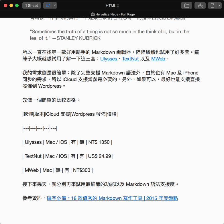 後記:關於 Markdown 表格語法的不支援,開發者也提供利用串接其他工具(Marked)的小技巧來解決:《Using Tables With Ulysses and Marked》