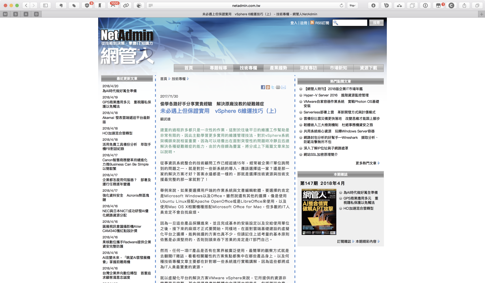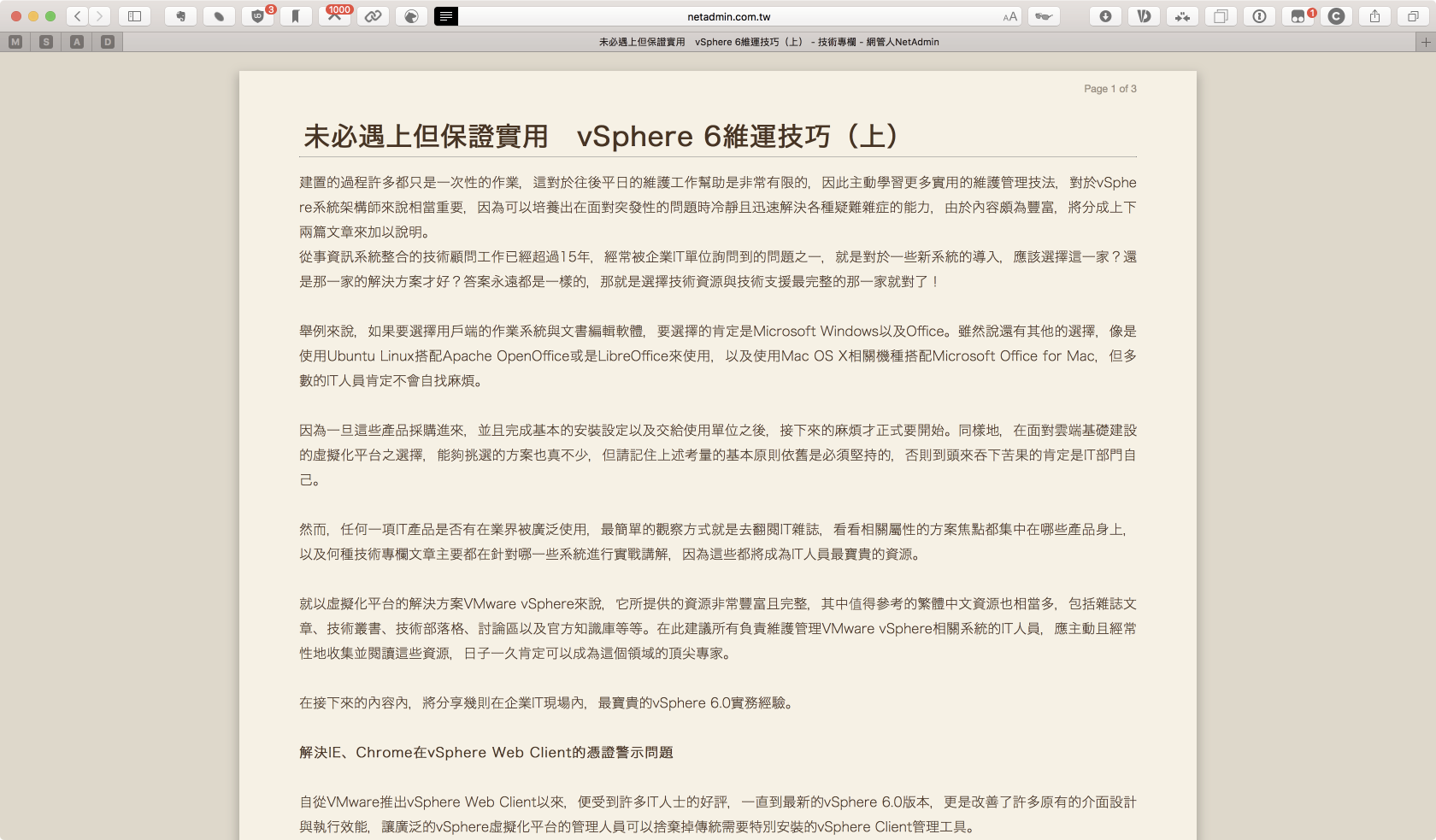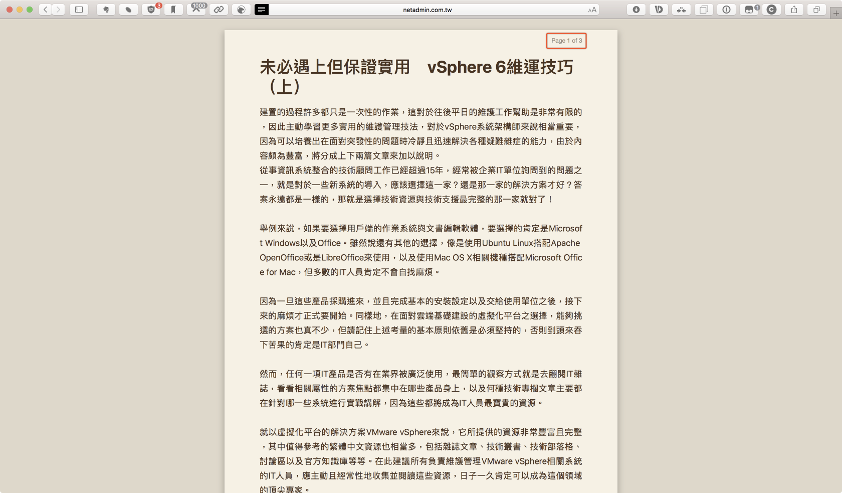 我找了個蠻常閱讀瀏覽的網站(網管人NetAdmin),隨機選了一篇專題文章:《未必遇上但保證實用 vSphere 6維運技巧(上)》來測試一下。除了頁面排版稍微再複雜一些,另外還做了分頁處理。測試下來,就真的差異很大了: