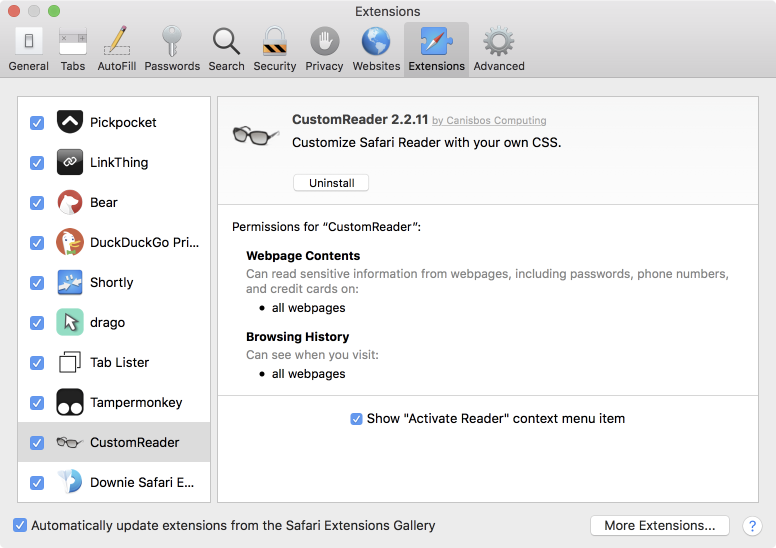 正在心裡徒呼負負時,驀然想起之前曾記錄了幾個我常用的 Safari Extensions(好用的 Safari extensions)。在那個我認為的 Safari Extensions 寶庫網站 ─ Canisbos Safari Extensions 裡,隱約記得似乎有個可調整更多 Safari Reader 設定的 extension?於是馬上找出書籤前去挖寶,果然印象沒錯,真的就有這麼一個 CustomReader extension: