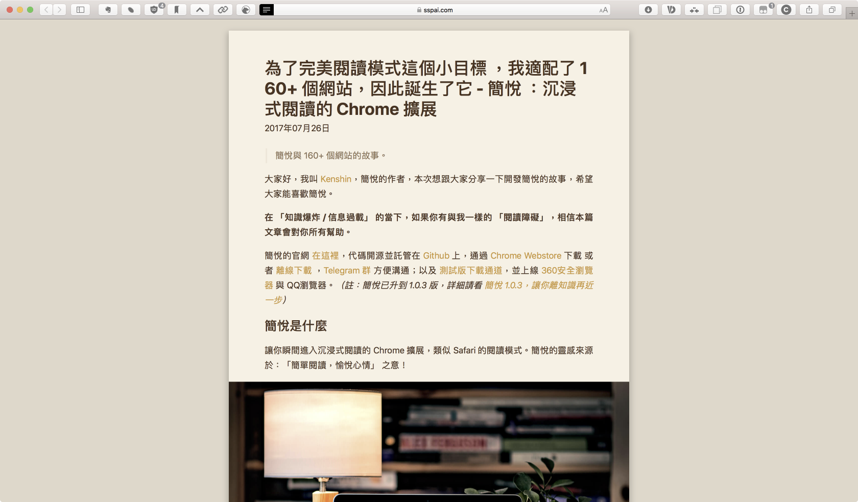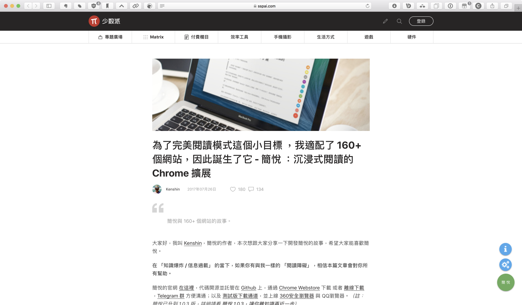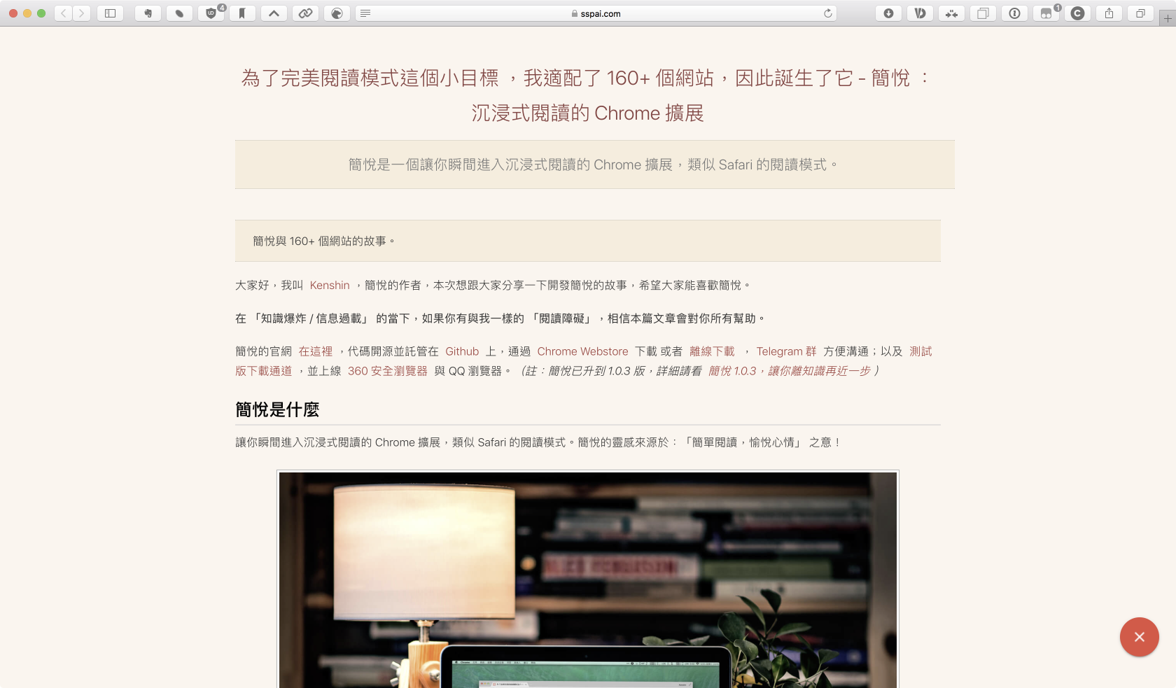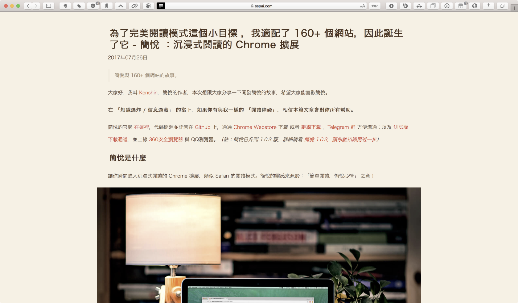 今天在 RSS 訂閱的文章中看到一篇文章:《簡悅 · 輕閱版 – 支持 Safari、Edge 的瀏覽器沈浸式閱讀模式工具 UserScript 腳本 - 小眾軟件》,介紹一個瀏覽器的小外掛(插件):