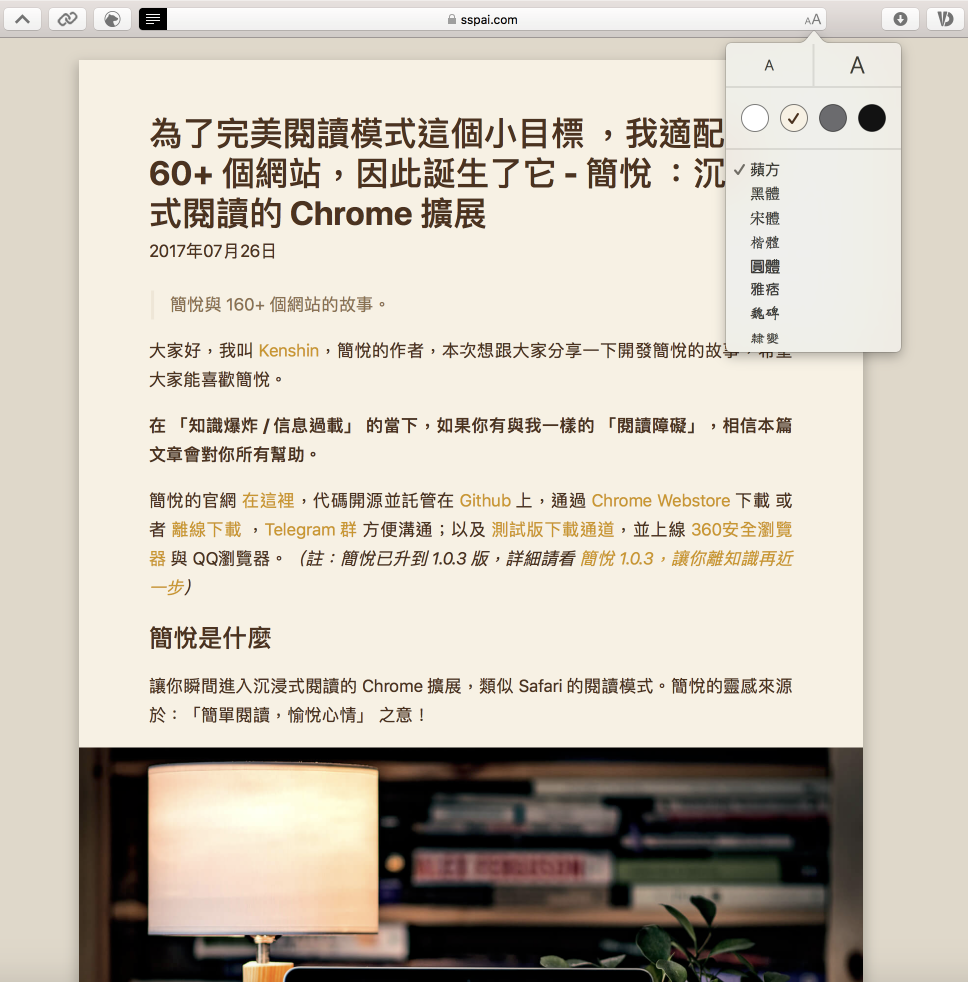 這一測試下來,不免覺得有點可惜,如果可以讓 Safari 原生閱讀模式加上簡悅美觀舒適的排版,豈不美哉?但就像前面顯示的:Safari 原生閱讀模式能調整的就是只有字型、大小及背景顏色這三種選項……