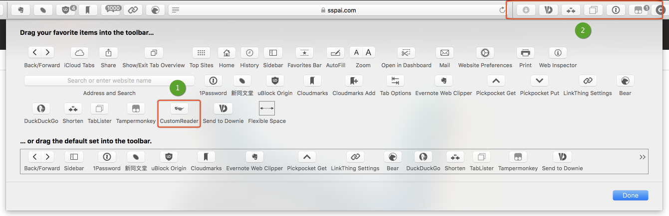迫不及待下載 extension 檔案後,直接點二下,由於是非 Safari 官方上架的 extension,所以在詢問時選擇 Trust 後就可以順利安裝。安裝完成後最好還是關閉重啟 Safari 來確保可以完整使用這個 extension 的功能。另外,我也把這個功能按鈕拖到 Toolbar 上以方便快速調整一些設定(View → Customize Toolbar...)。