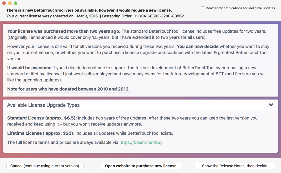 前幾天電腦開機後看到愛用的 BTT(Better Touch Tool)跳出更新通知訊息後,這才發現原來 BTT 的付費更新週期是二年一次?!而正好在此之前也才剛收到 BTT 進 Setapp 的通知!這還真是僥倖,直接無縫接軌替換成 Setapp 的版本。