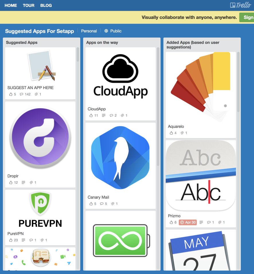 而且,Setapp 還提供管道讓使用者上提建議希望可以加入的軟體程式:一是官網所有程式列表的右下角就有個「Suggest An App」按鈕,點按後就可以輸入建議加入的軟體名稱及網址。此外,在 Trello 上也有個 Setapp 的看板可以提出建議以及看到正在進行中的加入軟體計劃列表。話說,我還曾經在官網建議過 BusyCal(一個也是我用了很久的行事曆工具),沒想到約略就在一個星期前左右還真收到通知已經加入了?!