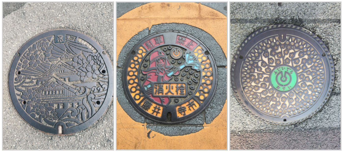 看到這些拓印,就想起在日本旅遊時,我也很愛拍攝日本的人孔蓋。總覺得日本的人孔蓋很漂亮,不同的城市鄉鎮都會有自己特有的圖紋造型。這是我上回去日本時拍的幾張人孔蓋照片: