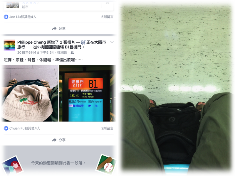 今天要補班,早上在捷運途中打開 Facebook,大大的「我的這一天」動態回顧,顯眼的秀出去年今日我一個人正準備要出發前往大阪走走。巧合的是出門前我決定穿短褲,竟是和去年機場的打卡照幾乎是完全相同的裝備:同件短褲、同雙涼鞋、同個背包,就只差了那頂休閒帽!於是順手拍了張照,為這樣的巧合留個有趣的對照記錄。