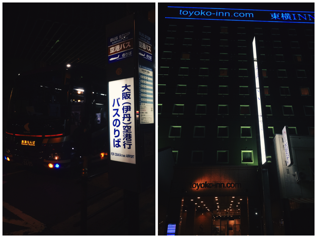 幸好出機場大廳門口,看到巴士的營業窗口似乎還有人。於是,拿著地圖問這裡的工作人員,用著英文兼比手劃腳半天。當然他是用日文回答,倒是有聽到「難波」以及 Taxi 這樣的字眼。勉強判斷是要我先坐巴士到難波,再來應該是要我換搭計程車。於是運氣不錯的我搭上了 12 點 40 幾分最末班往難波的巴士,終於離開機場了。