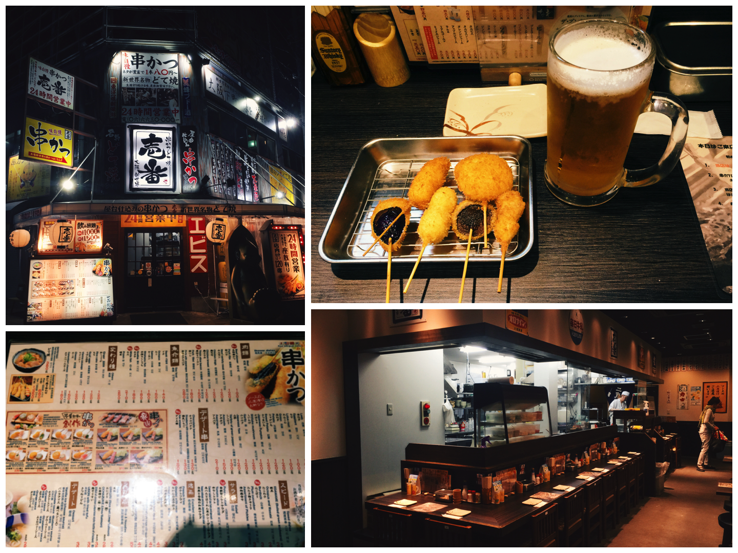 接下來才是真正最有意思的回憶:幾番折騰順利入住後,終於肚子感覺到餓了。本來是出門打算找個便利商店,隨便買點東西充飢就好。沒想到路口就是間 24 小時的炸串店?!當然就不客氣的用「深夜食堂」的啤酒加炸串,為我的大阪幾日隨意遊揭開序幕囉……