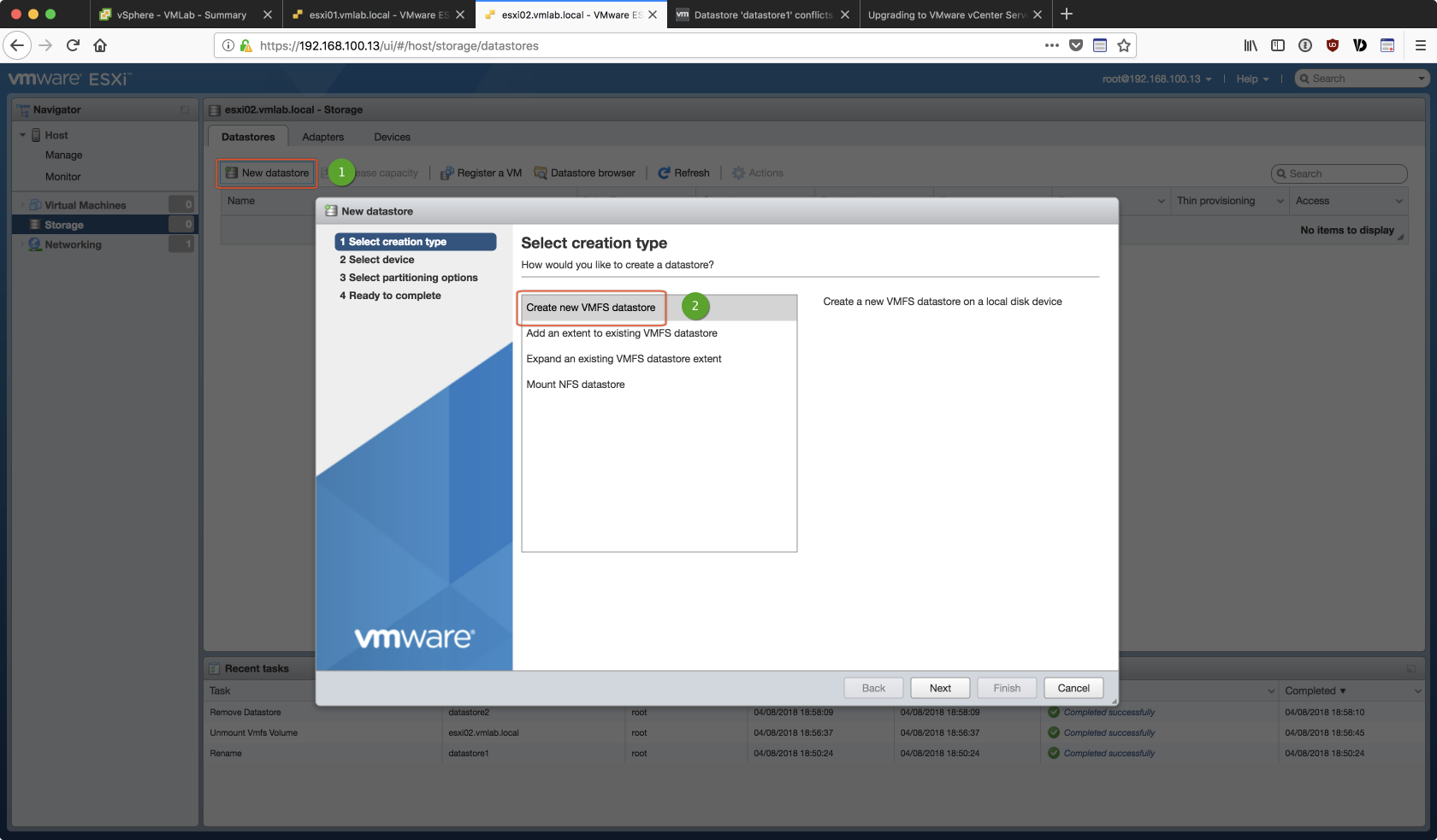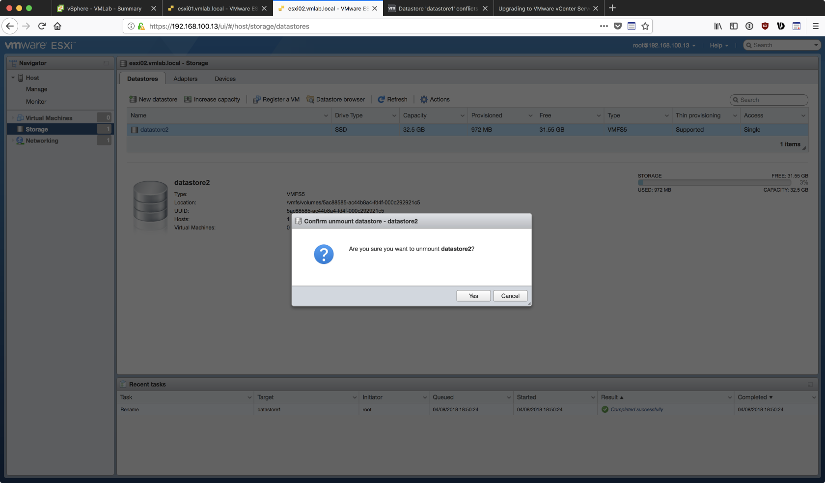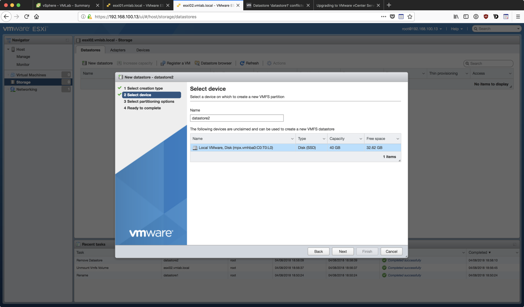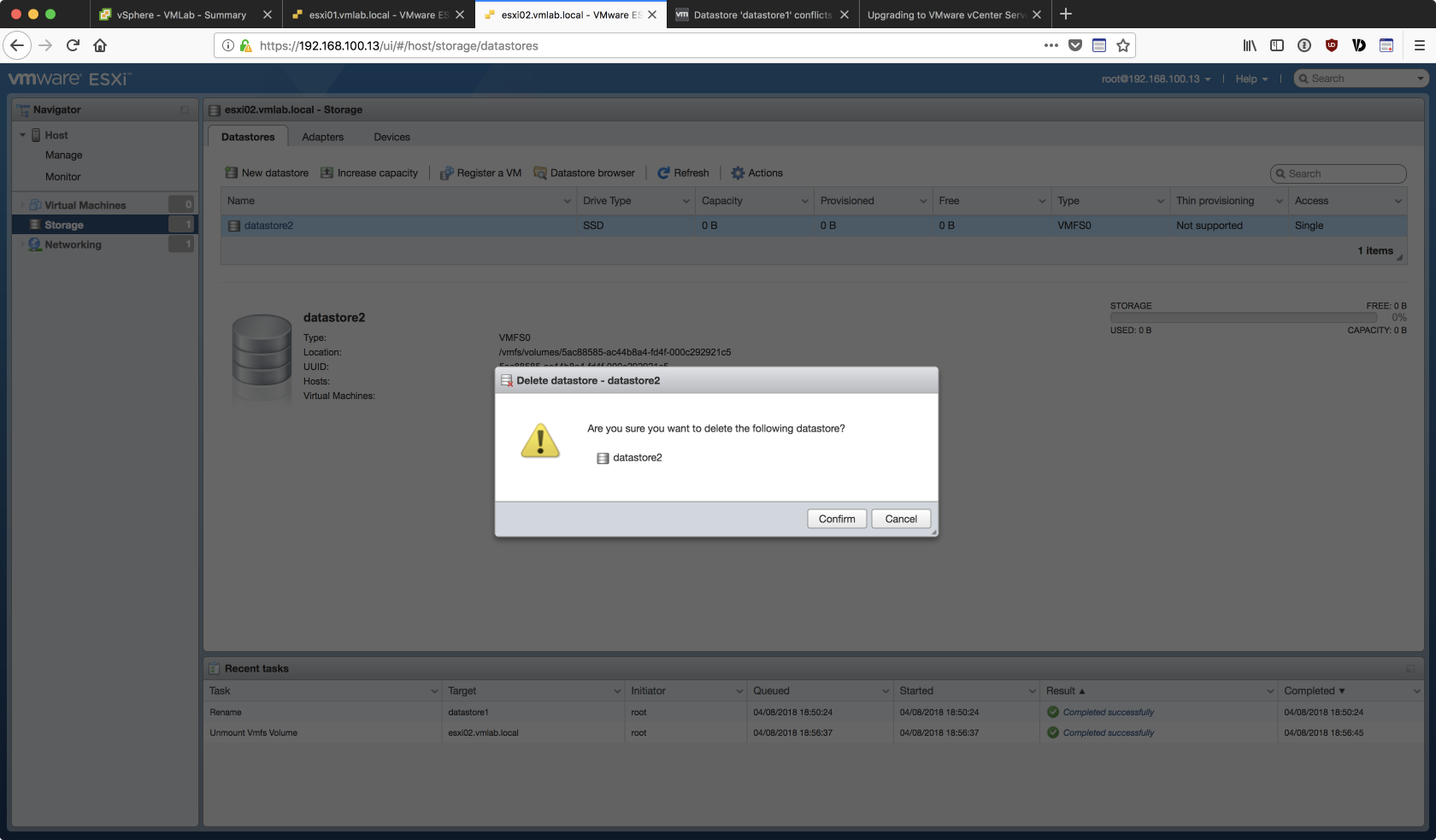 由於是用 Linked Clone 的方式複製出第二台的 ESXi 虛擬主機,若不對 esxi02 的 Storage 重做調整,在後續加入 vCenter 的過程中會出現如下的 datastore 衝突的錯誤: