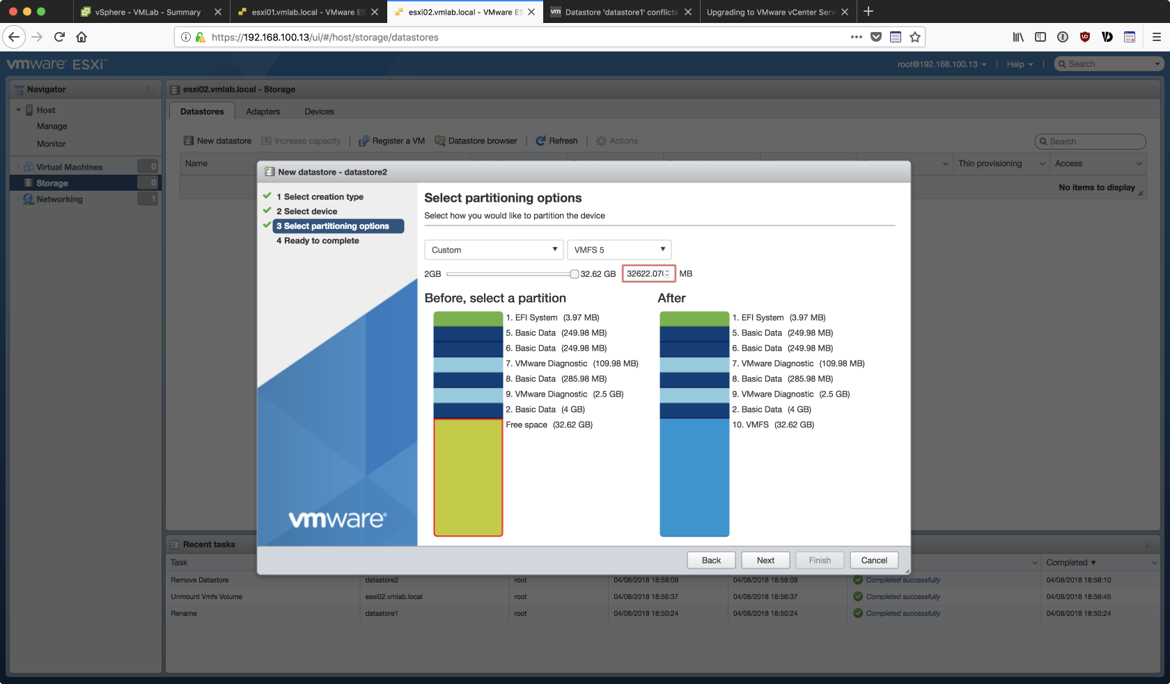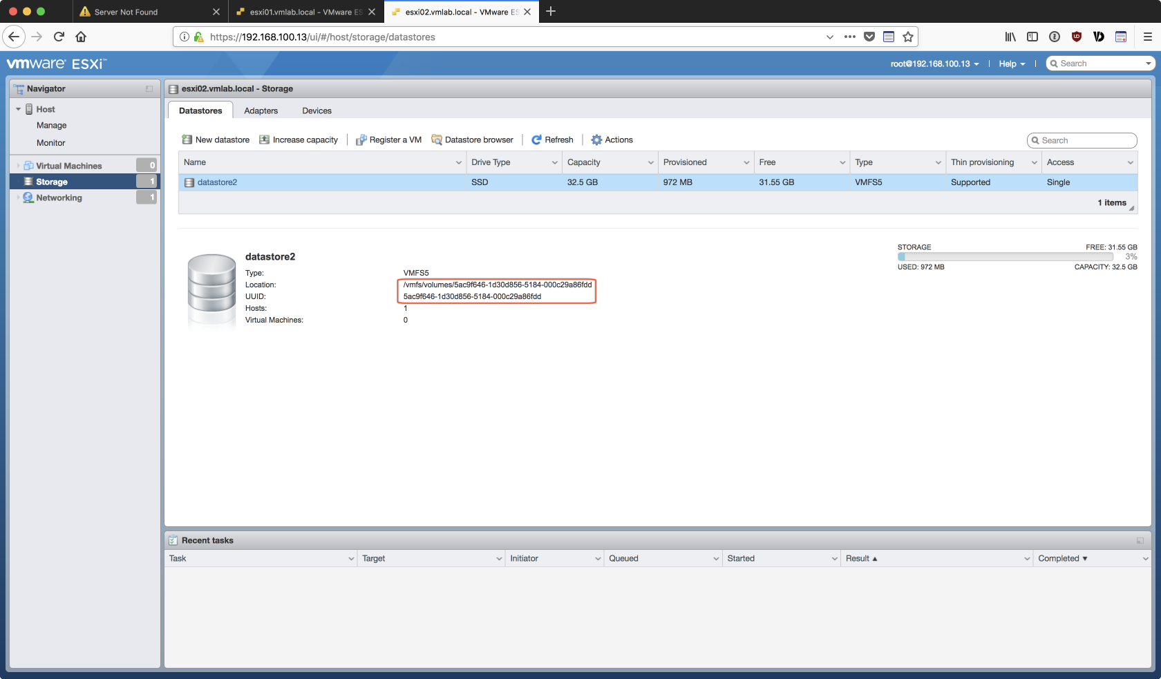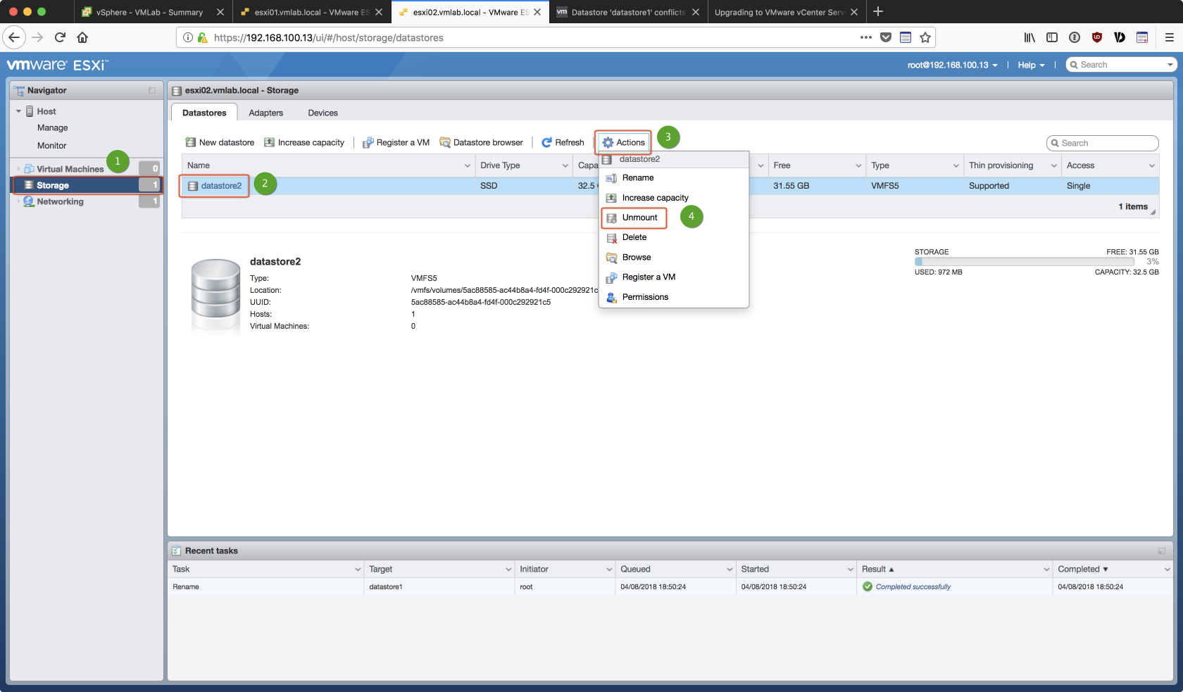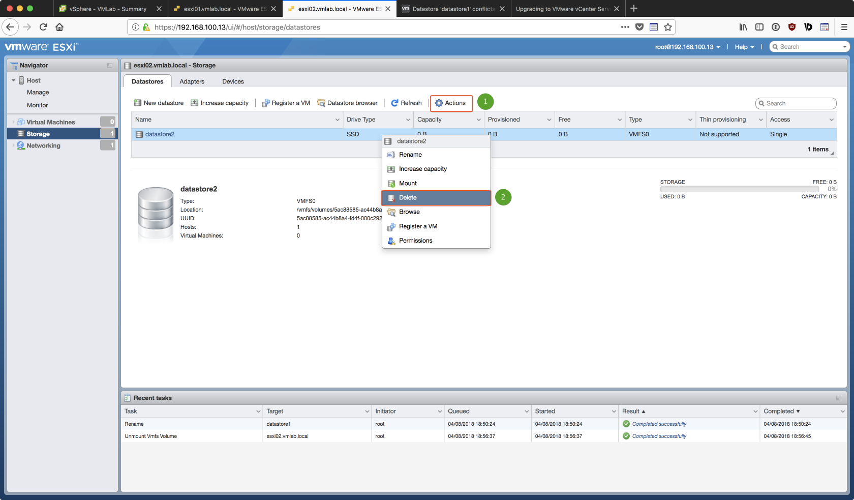 由於是用 Linked Clone 的方式複製出第二台的 ESXi 虛擬主機,若不對 esxi02 的 Storage 重做調整,在後續加入 vCenter 的過程中會出現如下的 datastore 衝突的錯誤: