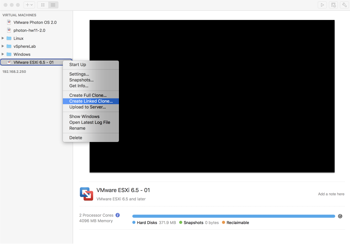 在前面文章中提到,可以在安裝好第一台 ESXi 虛擬機後,再重覆同樣的步驟繼續新建及安裝第二台 ESXi 虛擬機。但如果是使用 VMware Fusion Pro(或 VMware Workstation Pro),就可以利用 Clone 的方式來複製虛擬機而不必重覆這個新建及安裝的過程。當然如果使用的是一般版的 VMware Fusion(或 VMware Player) 就不支援這個功能了。