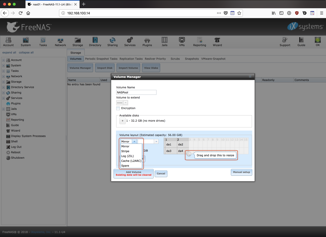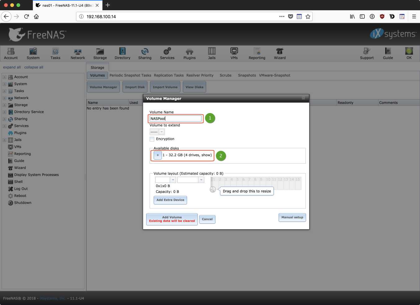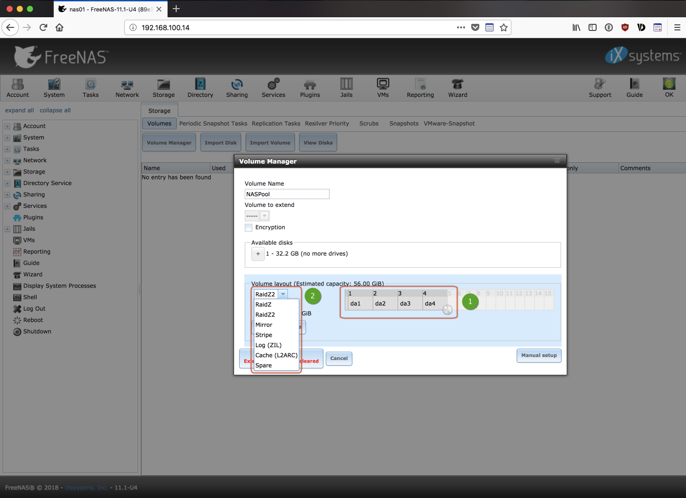 根據官方的使用手冊(8. Storage)說明,Volumes 的建立有不同的類型,也各有最低的需求條件。如果想要有 RAIDZ1 以上的功能就必須提供至少 3 顆以上的硬碟:
