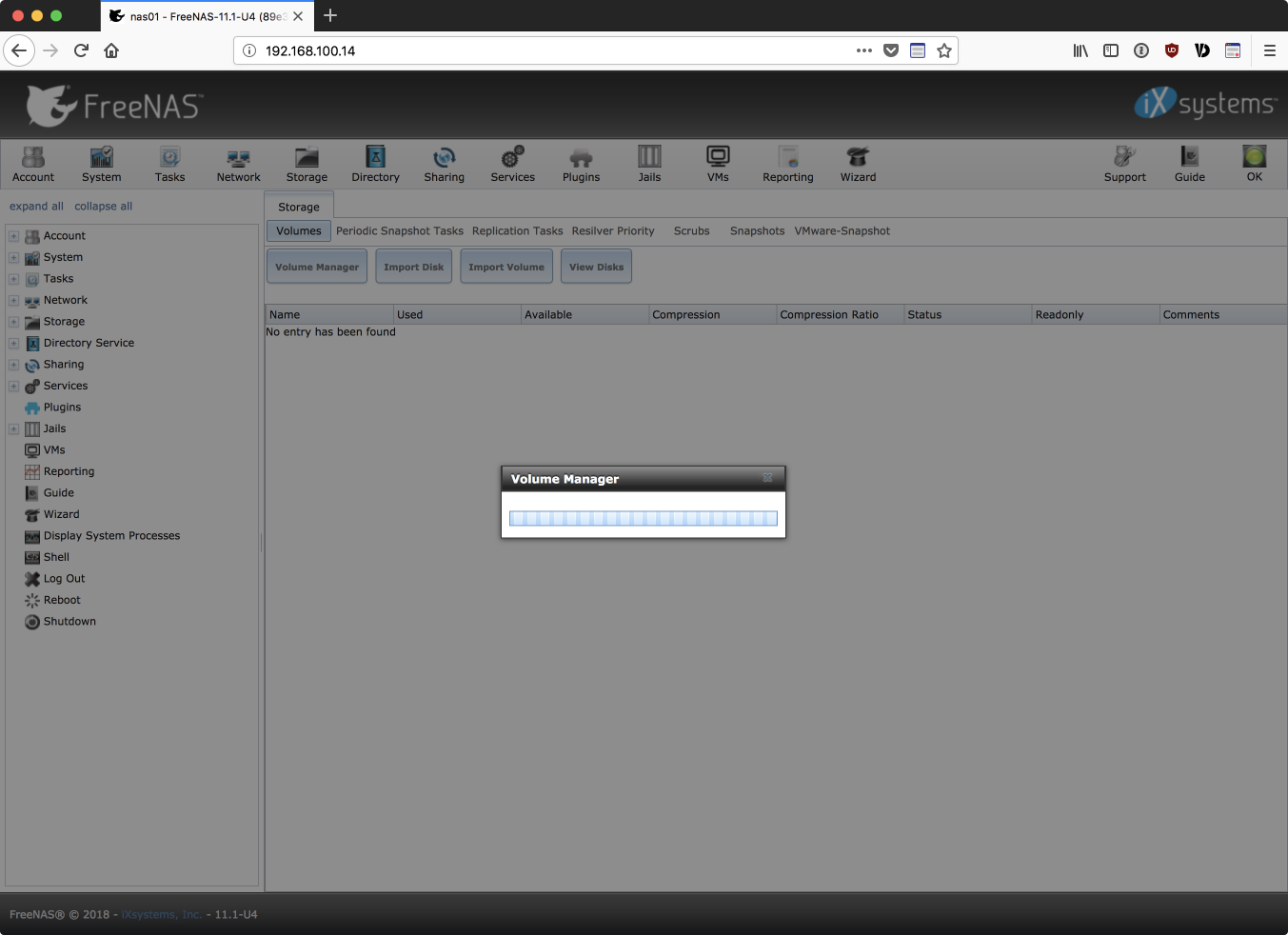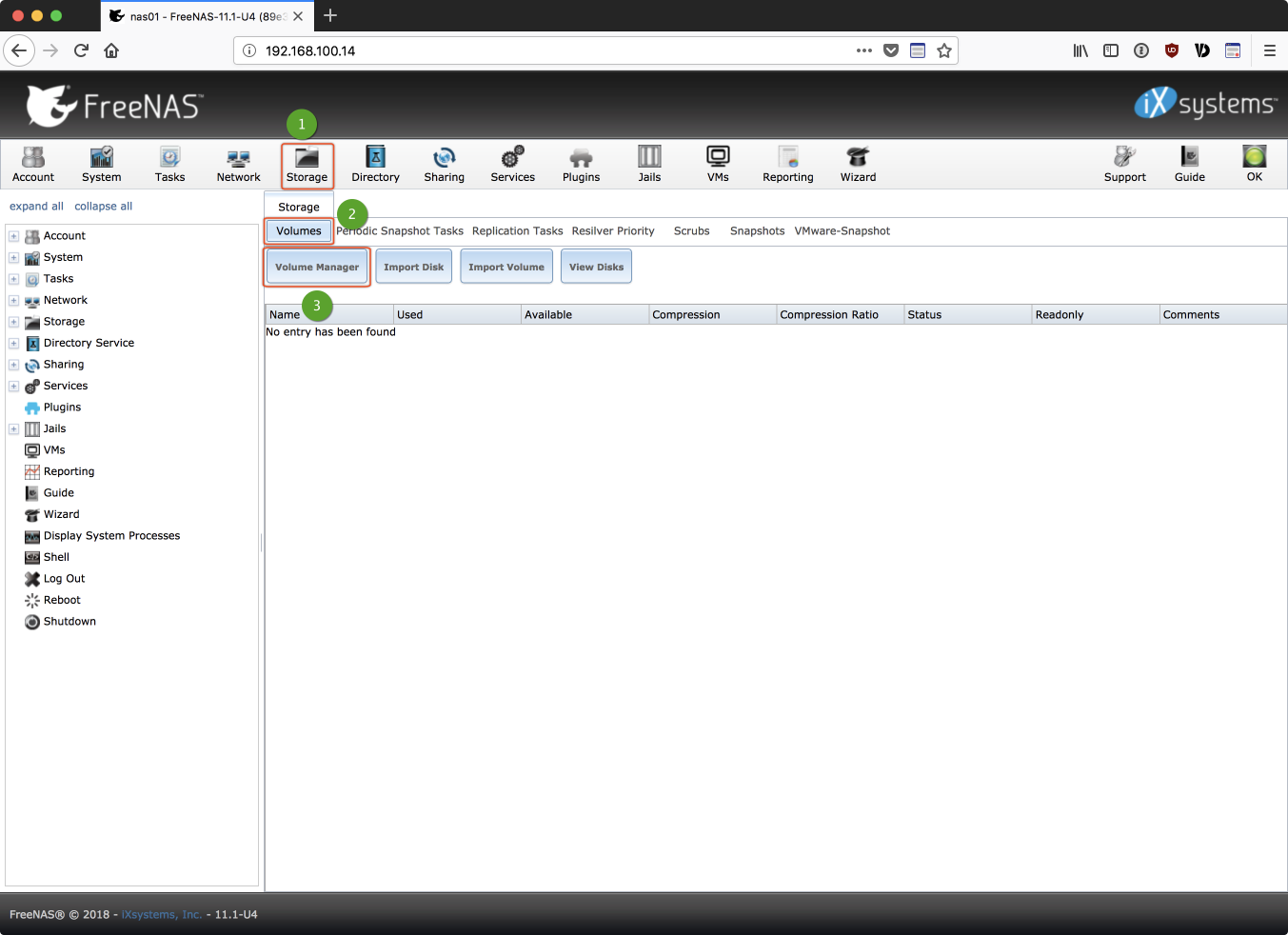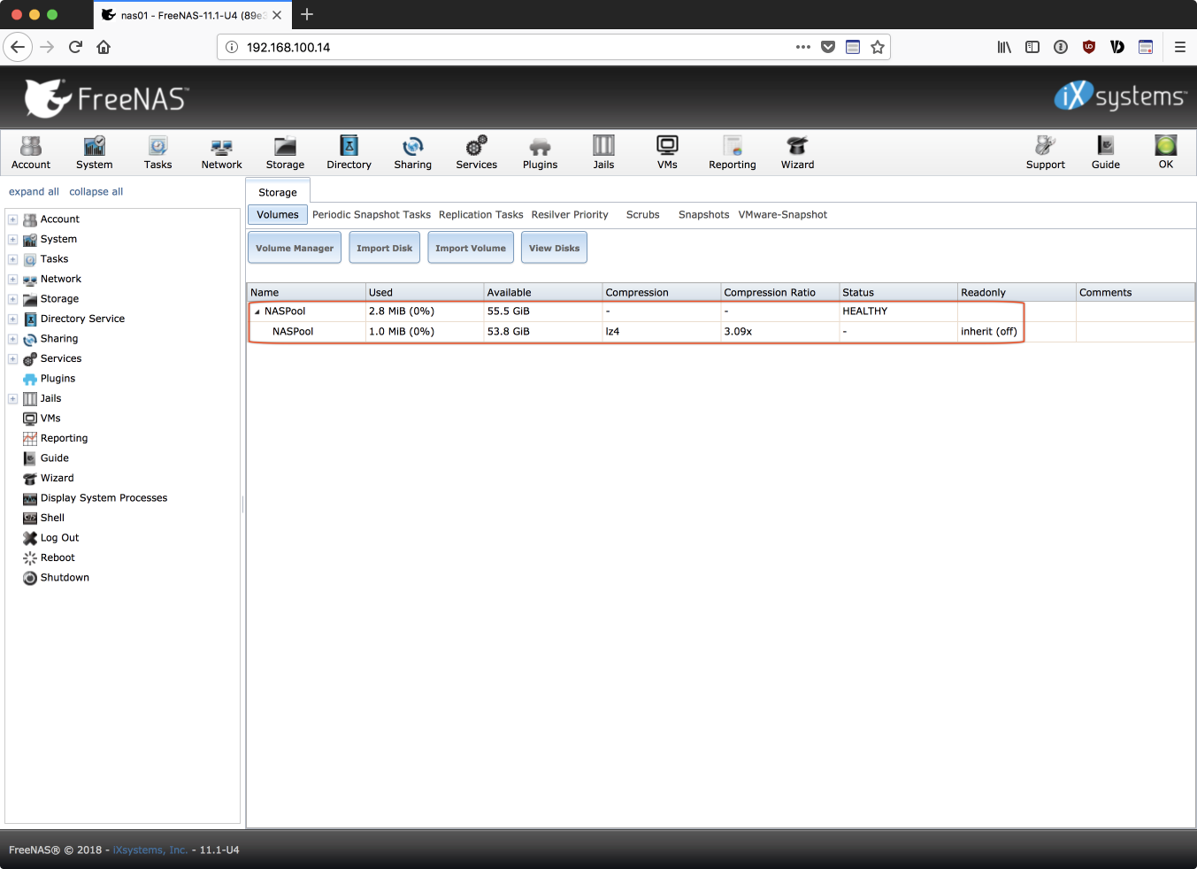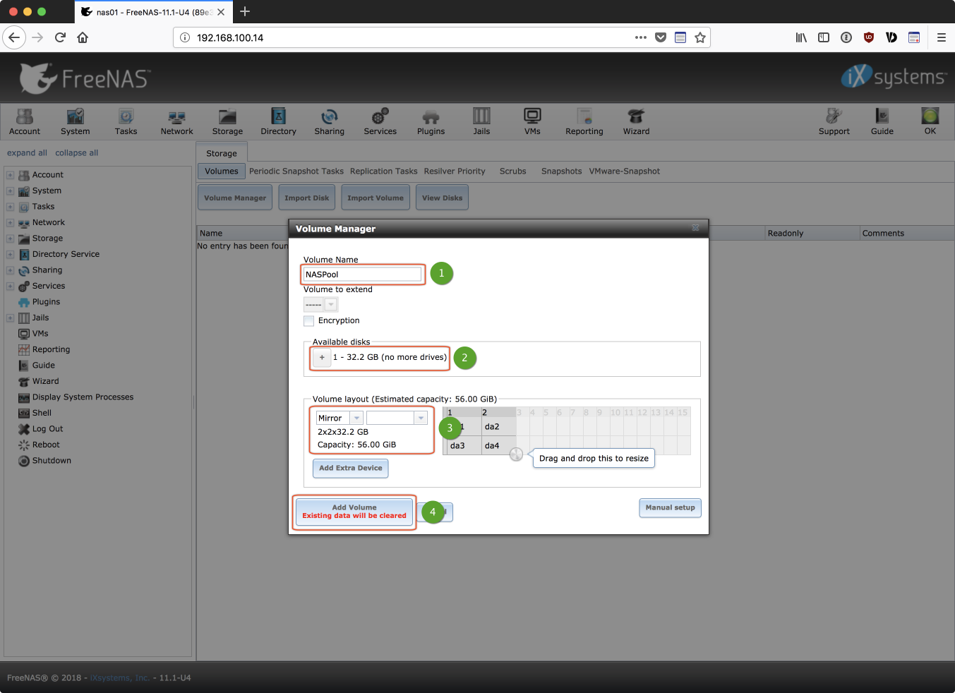根據官方的使用手冊(8. Storage)說明,Volumes 的建立有不同的類型,也各有最低的需求條件。如果想要有 RAIDZ1 以上的功能就必須提供至少 3 顆以上的硬碟: